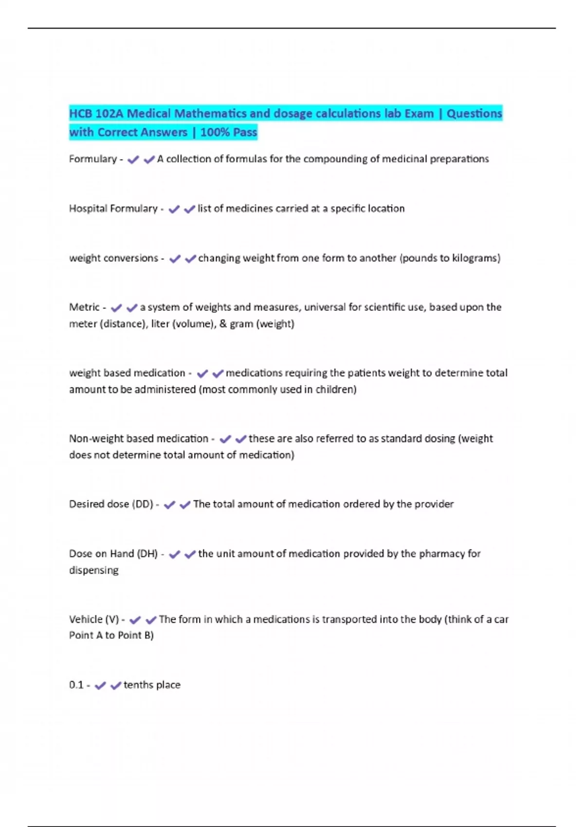 HCB 102A Medical Mathematics and dosage calculations lab Exam | Questions with Correct Answers | 100% Pass