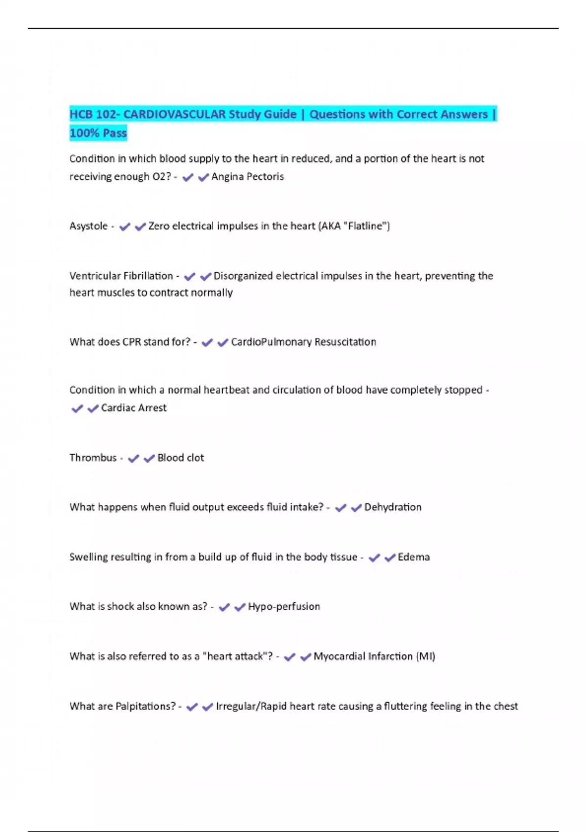 HCB 102- CARDIOVASCULAR Study Guide | Questions with Correct Answers | 100% Pass