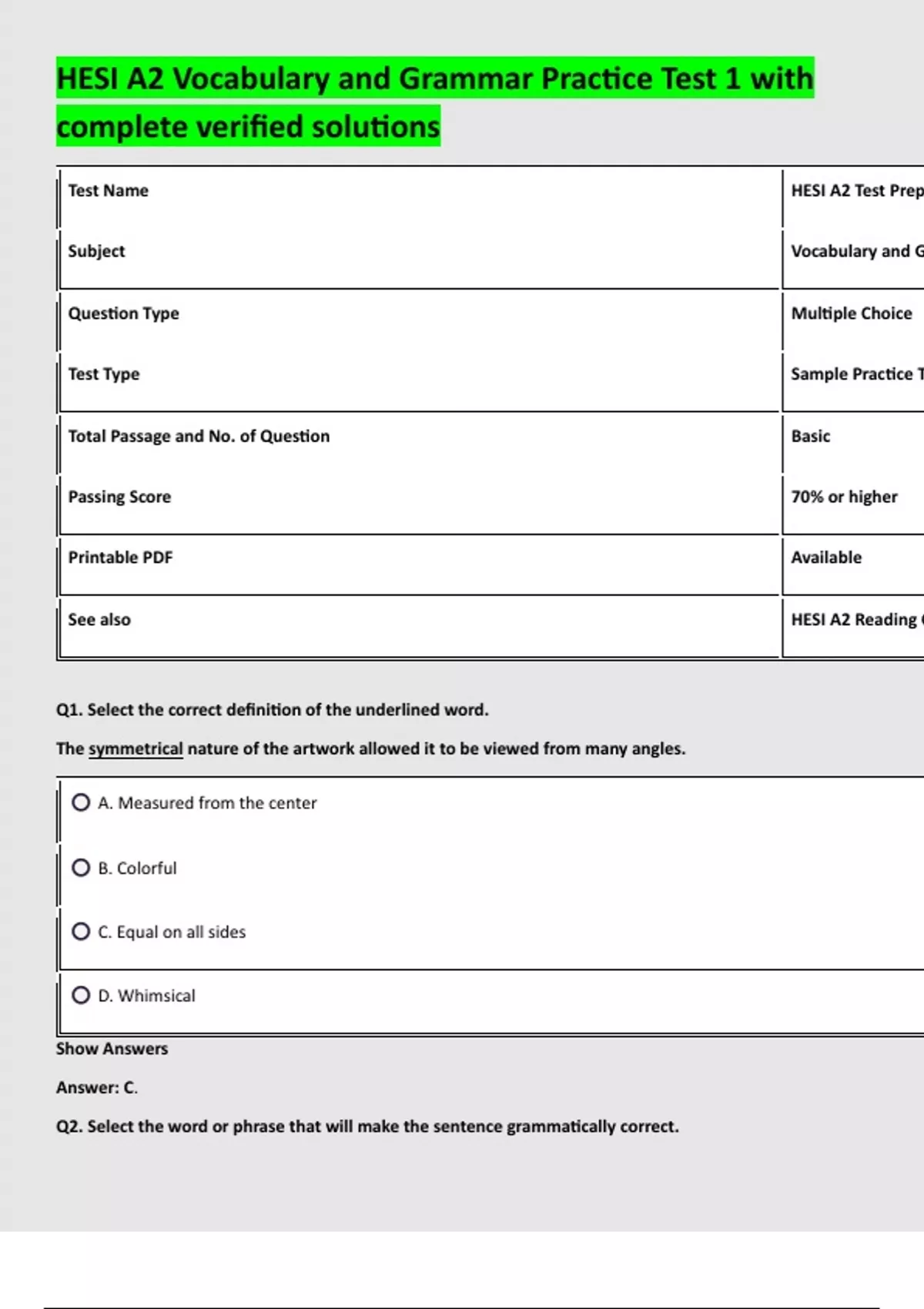 HESI A2 Vocabulary and Grammar Practice Test 1 with