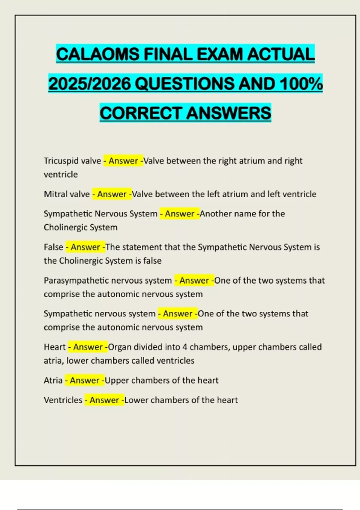 CALAOMS FINAL EXAM ACTUAL 2025/2026 QUESTIONS AND 100% CORRECT ANSWERS Tricuspid valve - Answer -Valve between the right atrium and right ventricle Mitral valve - Answer -Valve between the left atrium and left ventricle Sympathetic Nervous System - Answer -Another name for the Cholinergic System False - Answer -The statement that the Sympathetic Nervous System is the Cholinergic System is false Parasympathetic nervous system - Answer -One of the two systems that comprise the autonomic nervous system Sympathetic nervous system - Answer -One of the two systems that comprise the autonomic nervous system Heart - Answer -Organ divided into 4 chambers, upper chambers called atria, lower chambers called ventricles Atria - Answer -Upper chambers of the heart Ventricles - Answer -Lower chambers of the heartPulmonic vein - Answer -Vein that carries oxygenated blood from the lungs to the left atrium Left atrium - Answer -Atrium that receives oxygenated blood from the pulmonic vein Mitral valve - Answer -Valve between the left atrium and left ventricle Left ventricle - Answer -Ventricle that receives oxygenated blood from the left atrium and pumps it through the aortic valve Aortic valve - Answer -Valve between the left ventricle and the aorta Aorta - Answer -Main artery that carries oxygenated blood from the heart to the rest of the body SA node - Answer -Node that initiates the electrical impulses in the heart AV node - Answer -Node that receives the electrical impulses from the SA node and transmits them to the Bundle of His Bundle of His - Answer -Bundle of specialized fibers that conducts the electrical impulses from the AV node to