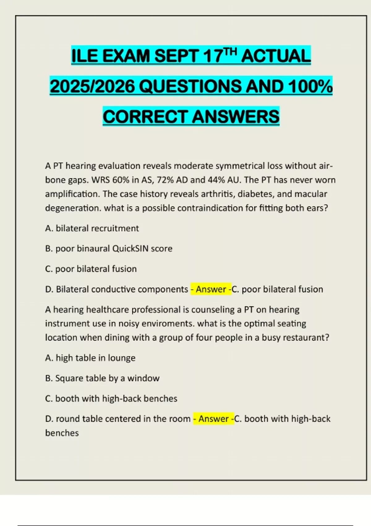 ILE EXAM SEPT 17TH ACTUAL 2025/2026 QUESTIONS AND 100% CORRECT ANSWERS A PT hearing evaluation reveals moderate symmetrical loss without airbone gaps. WRS 60% in AS, 72% AD and 44% AU. The PT has never worn amplification. The case history reveals arthritis, diabetes, and macular degeneration. what is a possible contraindication for fitting both ears? A. bilateral recruitment B. poor binaural QuickSIN score C. poor bilateral fusion D. Bilateral conductive components - Answer -C. poor bilateral fusion A hearing healthcare professional is counseling a PT on hearing instrument use in noisy enviroments. what is the optimal seating location when dining with a group of four people in a busy restaurant? A. high table in lounge B. Square table by a window C. booth with high-back benches D. round table centered in the room - Answer -C. booth with high-back benchesA PT with moderate, gradually sloping hearing loss requests assistance hearing better at the PT's place of worship, which has recently been looped. Which feature should the hearing healthcare professional recommend? A. bluetooth B. Directional microphones C. Telecoils D. Volume control - Answer -C. Telecoils A PT reports a longstanding history of untreated hearing loss. Testing confirms that the PT would benefit from amplification. Which information should be acquired from the PT before making a hearing instrument model recommendation? A. dominant hand B. PT living arrangments C. Style preference - Answer -C. Style preference A PT with moderate bilateral sensory/neural hearing loss has difficulty understanding speech in noise. The hearing healthcare professional is ordering canal hearing instruments. What should the hearing healthcare professional include to incr