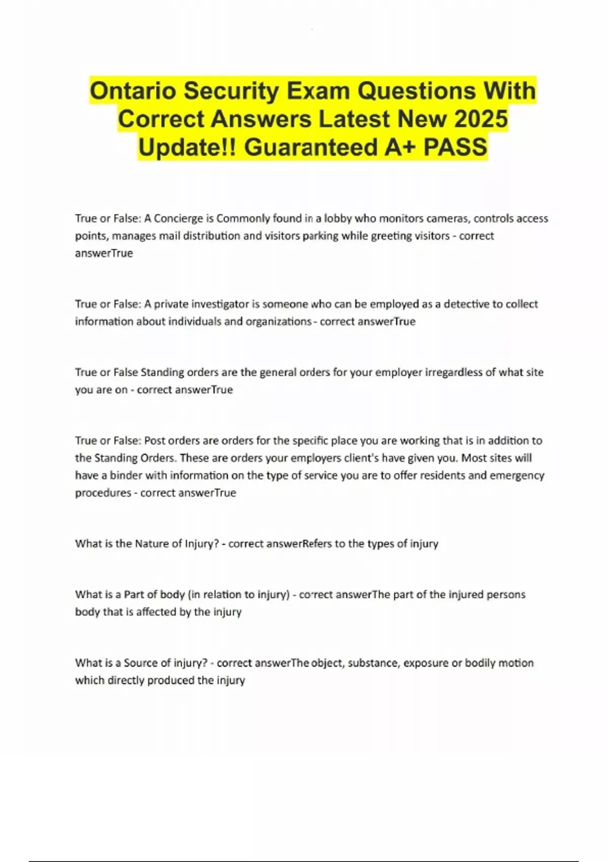 This document provides the latest 2025 edition of Ontario security guard exam questions with verified correct answers. It covers all relevant topics for the provincial licensing exam, including legal powers, use-of-force, access control, emergency response, report writing, ethics, and professional conduct. Ideal for learners preparing for certification or renewal, it reflects the current stand ards and guidelines administered by the Ontario Ministry of the Solicitor General.