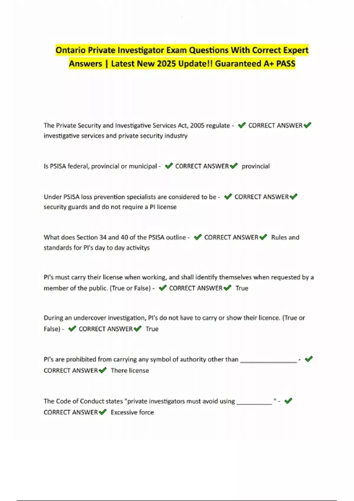 Ontario Private Investigator Exam Questions With Correct Expert Answers Latest New 2025 Update Guaranteed A+ PASS.pdf