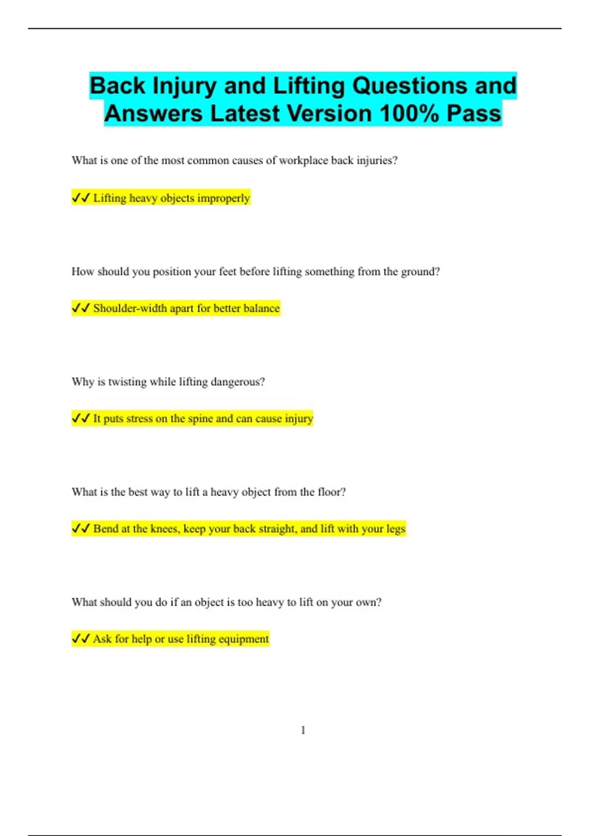 Back Injury and Lifting Questions and Answers Latest Version 100% Pass What is one of the most common causes of workplace back injuries? Lifting heavy objects improperly How should you position your feet before lifting something from the ground? Shoulder-width apart for better balance Why is twisting while lifting dangerous? It puts stress on the spine and can cause injury What is the best way to lift a heavy object from the floor? Bend at the knees, keep your back straight, and lift with your legs What should you do if an object is too heavy to lift on your own? Ask for help or use lifting equipment 2 What part of the body should do most of the work when lifting? The legs, not the back Why is it important to hold an object close to your body when lifting? It reduces strain on your back and helps with balance What should you do before lifting to avoid sudden movements? Test the weight of the object How can stretching help prevent back injuries? It loosens muscles and prepares your body for physical activity What is the safest posture for your back when lifting or carrying something? A straight, neutral spine Why should you avoid lifting and reaching at the same time? It increases pressure on your lower back and reduces control 3 What should you do if you start feeling pain while lifting? Stop immediately and report it to a supervisor or health provider How can frequent lifting of small loads still cause back injury? Repetitive motion and poor posture can lead to strain over time Why is it risky to lift an object above your shoulders? It forces your back and arms into unnatural positions What is the purpose of team lifting? To share the weight and reduce individual strain Why is proper footwear important when lifting at work? It provides stability and reduces the risk of slips or falls What kind of surface should you stand on when lifting? A flat, non-slippery surface to ensure