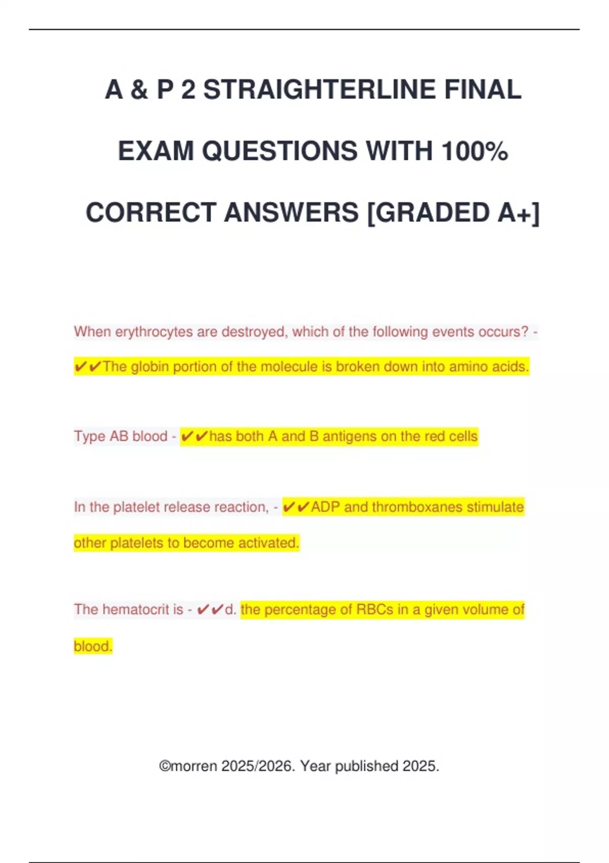 A & P 2 STRAIGHTERLINE FINAL EXAM QUESTIONS WITH 100% CORRECT ANSWERS [GRADED A+] When erythrocytes are destroyed, which of the following events occurs? - The globin portion of the molecule is broken down into amino acids. Type AB blood - has both A and B antigens on the red cells In the platelet release reaction, - ADP and thromboxanes stimulate other platelets to become activated. The hematocrit is - d. the percentage of RBCs in a given volume of blood. ©morren 2025/2026. Year published 2025. What vitamin is necessary to produce many clotting factors in the liver? - Vitamin K A white blood cell engulfing a bacterium is an example of blood functioning in - a. protection. The oxygenated form of hemoglobin is called - oxyhemoglobin The only formed elements that possess a nucleus when mature are the - c. leukocytes Plasma - . is the liquid matrix of the blood. An increased amount of heparin in the blood might - . prevent clotting process. On which chromosome is there a mutation that leads to sickle cell anemia? - b. chromosome 11 ©morren 2025/2026. Year published 2025.