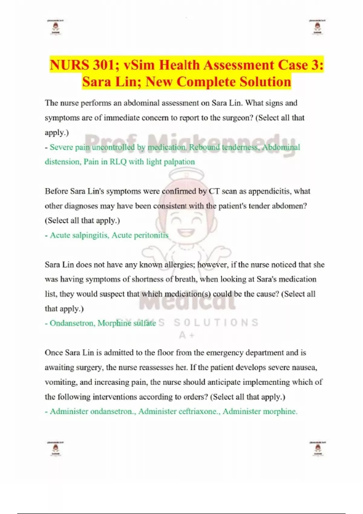 NURS 301; vSim Health Assessment Case 3: Sara Lin; New Complete Solution-The nurse performs an abdominal assessment on Sara Lin. What signs and symptoms are of immediate concern to report to the surgeon? (Select all that apply.) - Severe pain uncontrolled by medication, Rebound tenderness, Abdominal distension, Pain in RLQ with light palpation Before Sara Lin's symptoms were confirmed by CT scan as appendicitis, what other diagnoses may have been consistent with the patient's tender abdomen? (Select all that apply.) - Acute salpingitis, Acute peritonitis Sara Lin does not have any known allergies; however, if the nurse noticed that she was having symptoms of shortness of breath, when looking at Sara's medication list, they would suspect that which medication(s) could be the cause? (Select all that apply.) - Ondansetron, Morphine sulfate Once Sara Lin is admitted to the floor from the emergency department and is awaiting surgery, the nurse reassesses her. If the patient develops severe nausea, vomiting, and increasing pain, the nurse should anticipate implementing which of the following interventions according to orders? (Select all that apply.) - Administer ondansetron., Administer ceftriaxone., Administer morphine.