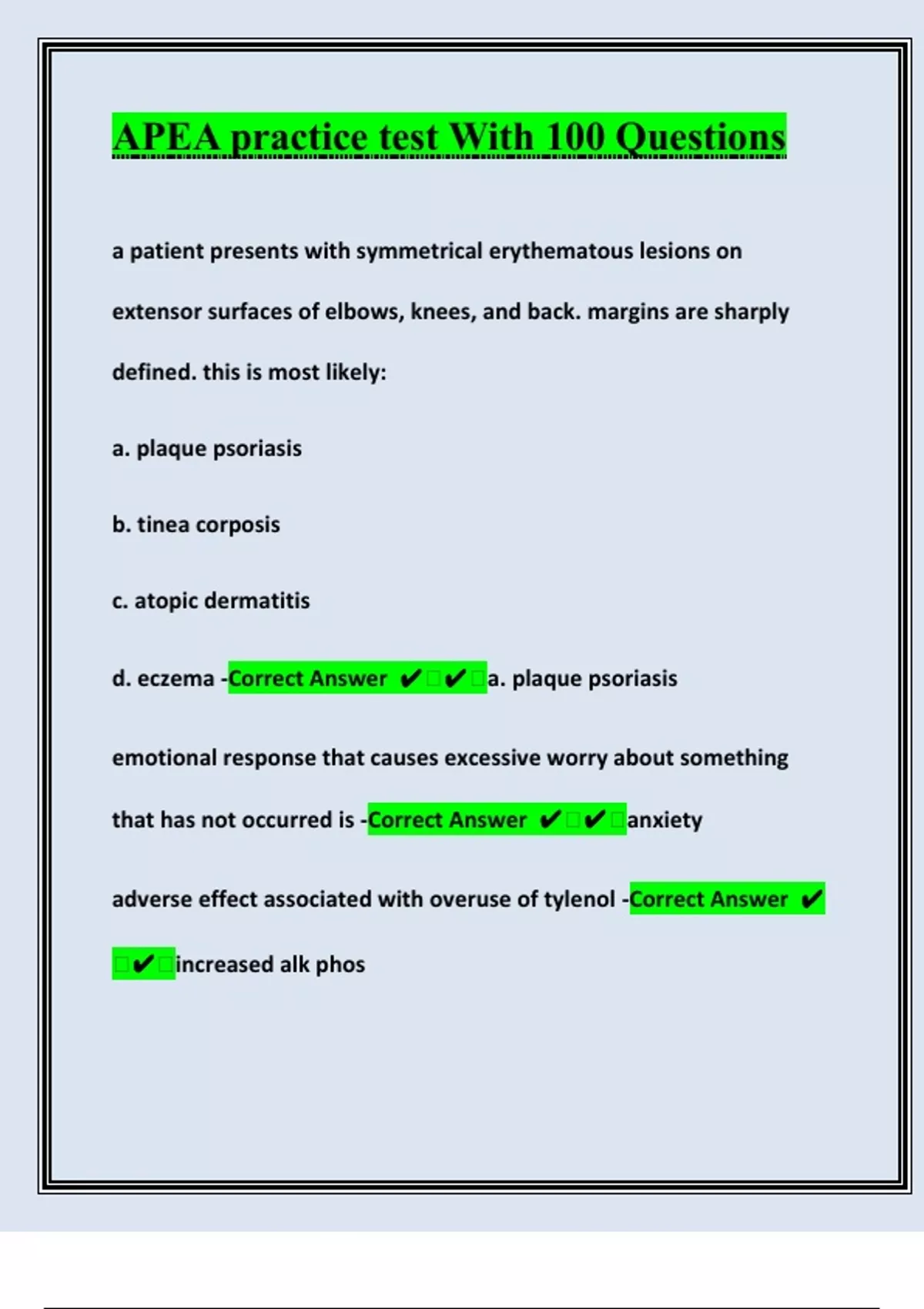 a patient presents with symmetrical erythematous lesions on extensor surfaces of elbows, knees, and back. margins are sharply defined. this is most likely: a. plaque psoriasis b. tinea corposis c. atopic dermatitis d. eczema -Correct Answer a. plaque psoriasis emotional response that causes excessive worry about something that has not occurred is -Correct Answer anxiety adverse effect associated with overuse of tylenol -Correct Answer increased alk phosuse of ritalin to manage ADHD can result in -Correct Answer tics