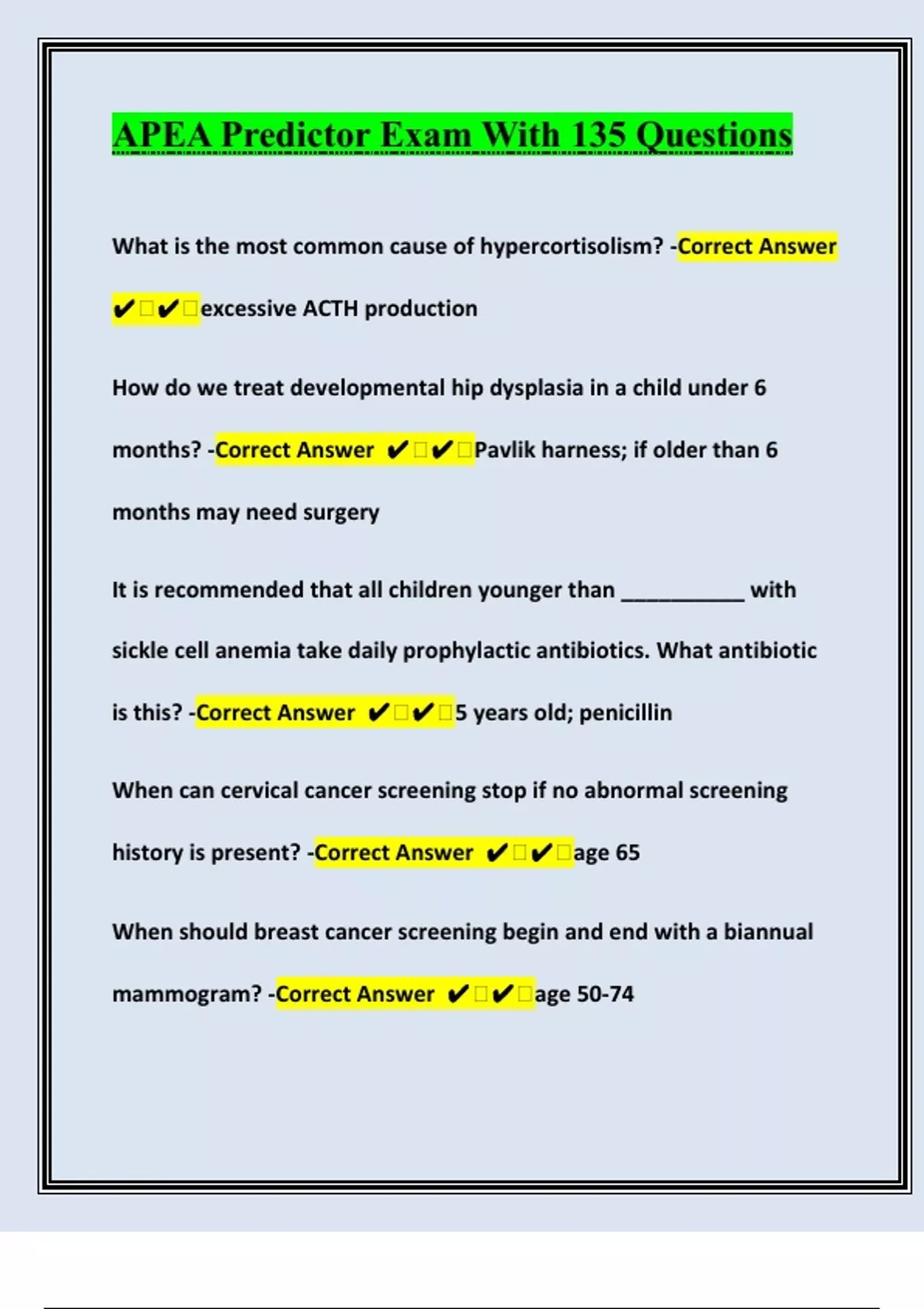 What is the most common cause of hypercortisolism? -Correct Answer excessive ACTH production How do we treat developmental hip dysplasia in a child under 6 months? -Correct Answer Pavlik harness; if older than 6 months may need surgery It is recommended that all children younger than __________ with sickle cell anemia take daily prophylactic antibiotics. What antibiotic is this? -Correct Answer 5 years old; penicillin When can cervical cancer screening stop if no abnormal screening history is present? -Correct Answer age 65 When should breast cancer screening begin and end with a biannual mammogram? -Correct Answer age 50-74
