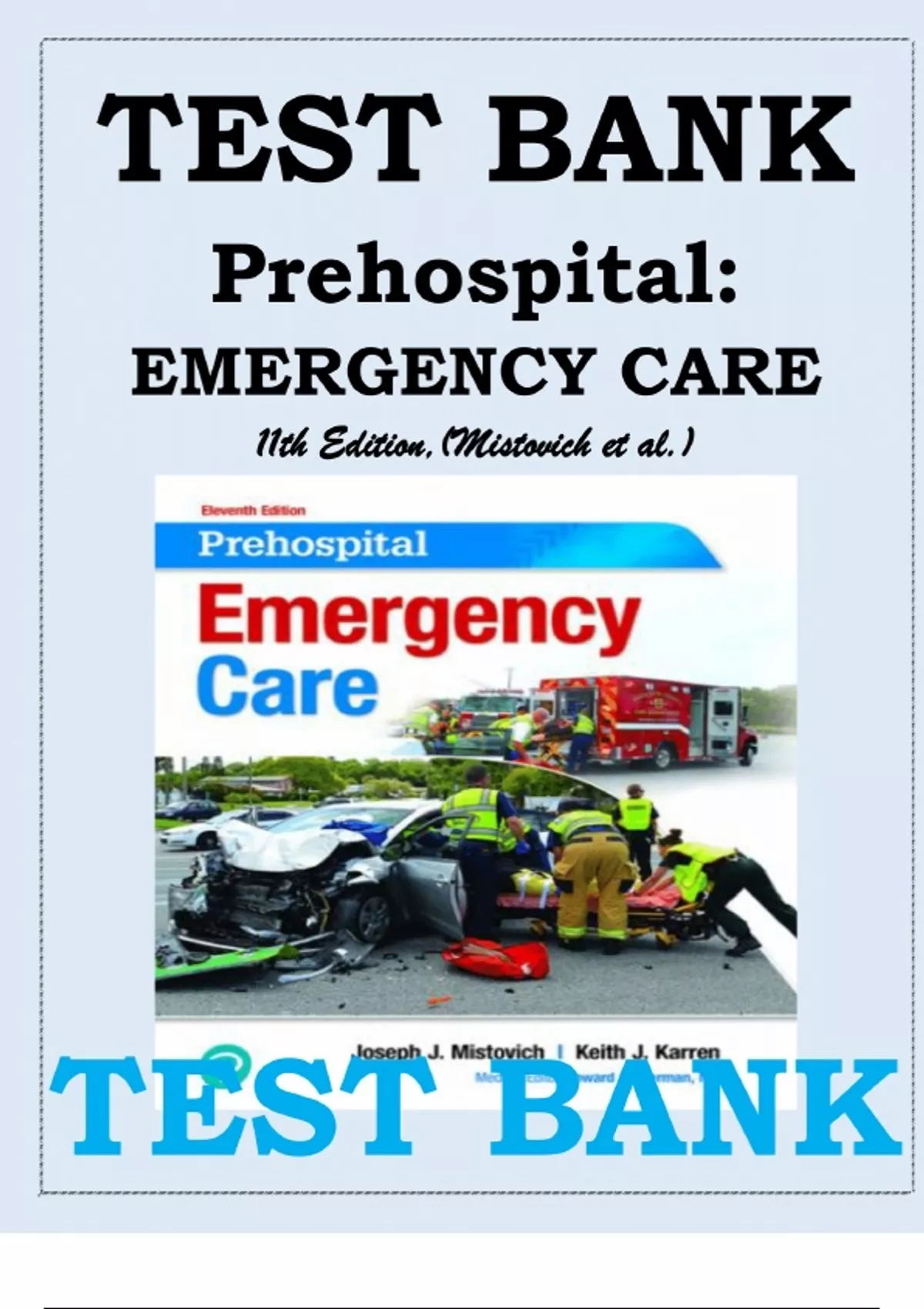 TEST BANK FOR PREHOSPITAL EMERGENCY CARE, 11TH EDITION BY JOSEPH MISTOVICH (Complete Test Bank Chapters 1-46) Prehospital Emergency Care, 11th edition (Mistovich et al.) Test Bank Table of Contents: PART 1: PREPARATORY AND PUBLIC HEALTH 1. Emergency Medical Care Systems, Research, and Public Health 2. Workforce Safety and Wellness of the EMT 3. Medical, Legal, and Ethical Issues 4. Documentation 5. Communication 6. Lifting and Moving Patients PART 2: ANATOMY, PHYSIOLOGY, AND MEDICAL TERMINOLOGY 7. Anatomy, Physiology, and Medical Terminology PART 3: PATHOPHYSIOLOGY 8. Pathophysiology PART 4: SPAN DEVELOPMENT 9. Life Span Development PART 5: AIRWAY MANAGEMENT, ARTIFICIAL VENTILATION, AND OXYGENATION 10. Airway Management, Artificial Ventilation, and Oxygenation PART 6: ASSESSMENT 11. Vital Signs, Monitoring Devices, and History Taking 12. Scene Size-Up13. Patient Assessment PART 7: GENERAL PHARMACOLOGY AND MEDICATION ADMINISTRATION 14. General Pharmacology and Medication Administration PART 8: SHOCK AND RESUSCITATION 15. Shock and Resuscitation PART 9: MEDICINE 16. Respiratory Emergencies 17. Cardiovascular Emergencies 18. Altered Mental Status, Stroke, and Headache 19. Seizures and Syncope 20. Acute Diabetic Emergencies 21. Allergic and Anaphylactic Reactions 22. Toxicologic Emergencies 23. Abdominal, Hematologic, Gynecologic, Genitourinary, and Renal Emergencies 24. Environmental Emergencies 25. Submersion Incidents: Drowning and Diving Emergencies 26. Psychiatric Emergencies PART 10: TRAUMA 27. Trauma Overview: The Trauma Patient and the Trauma System 28. Bleeding and Soft Tissue Trauma 29. Burns 30. Musculoskeletal Trauma and Nontraumatic Fractures 31. Head Trauma 32. Spinal Trauma and Spine Motion Restriction 33. Eye, Face, and Neck Trauma 34. Chest Trauma 35. Abdominal and Genitourinary Trauma 36. Multisystem Trauma and Trauma in Special Patient Populations PART 11: SPECIAL PATIENT POPULATIONS 37. Obstetrics and Care of the Newborn 38. Pediatrics 39. Geriatrics 40. Patients with Special Challenges 41. The Combat Veteran PART 12: EMS OPERATIONS 42. Ambulance Operations and Air Medical Response 43. Gaining Access and Patient Extrication 44. Hazardous Materials 45. Multiple-Casualty Incidents and Incident Management 46. EMS Response to Terrorist Incidents