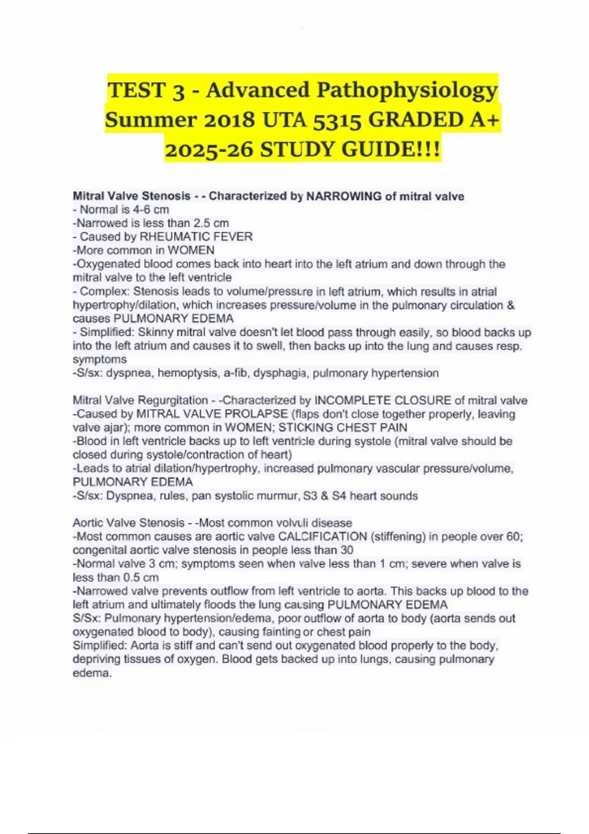 TEST 3 - Advanced Pathophysiology Summer 2018 UTA 5315 GRADED A+ 2025-26 STUDY GUIDE!! TEST 3 - Advanced Pathophysiology Summer 2018 UTA 5315 GRADED A+ 2025-26 STUDY GUIDE!!