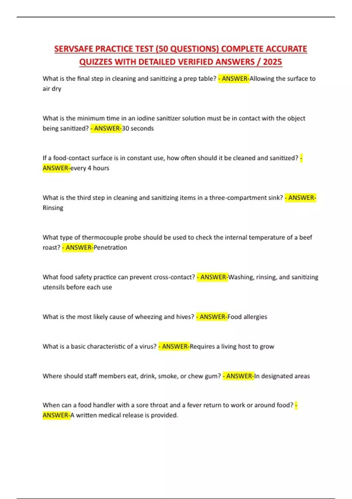 SERVSAFE PRACTICE TEST (50 QUESTIONS) COMPLETE ACCURATE QUIZZES WITH DETAILED VERIFIED ANSWERS / 2025