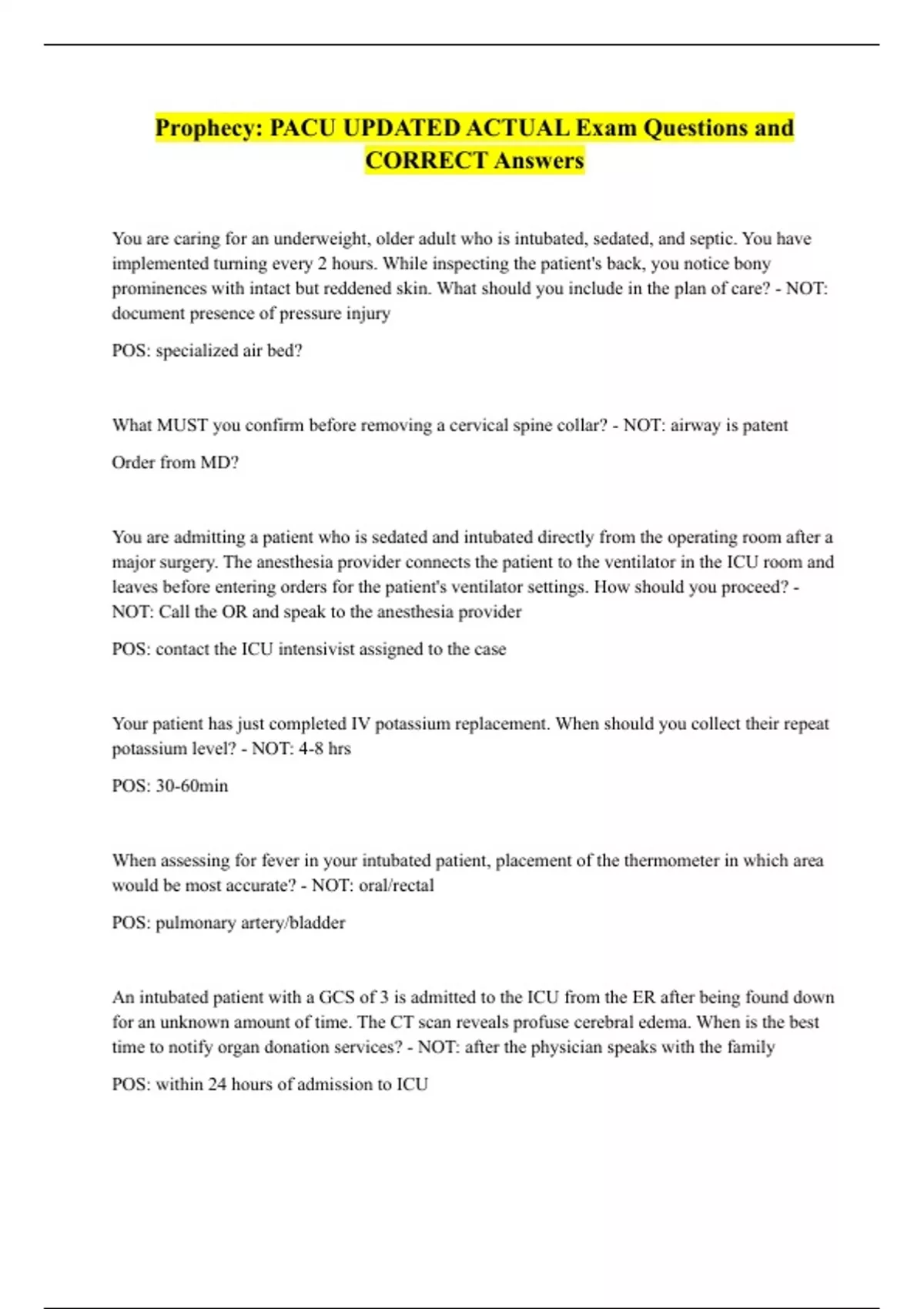 Prophecy: PACU UPDATED ACTUAL Exam Questions and
