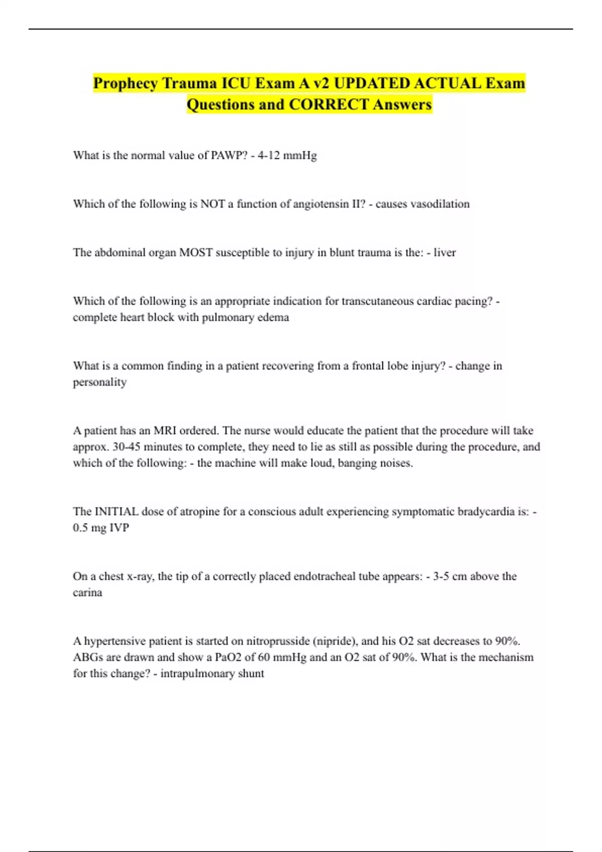 Prophecy Trauma ICU Exam A v2 UPDATED ACTUAL Exam