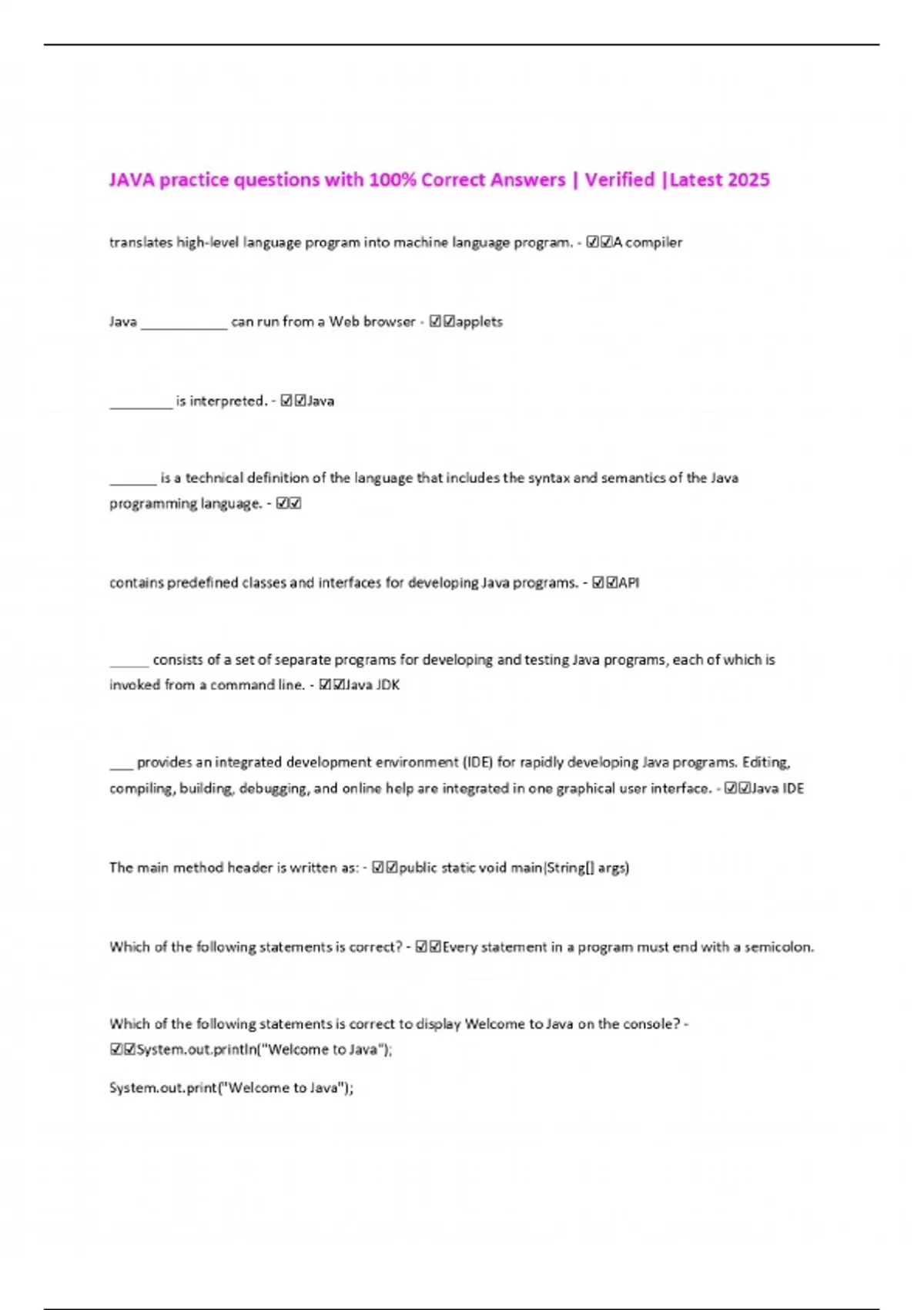 JAVA practice questions with 100% Correct Answers | Verified |Latest 2025