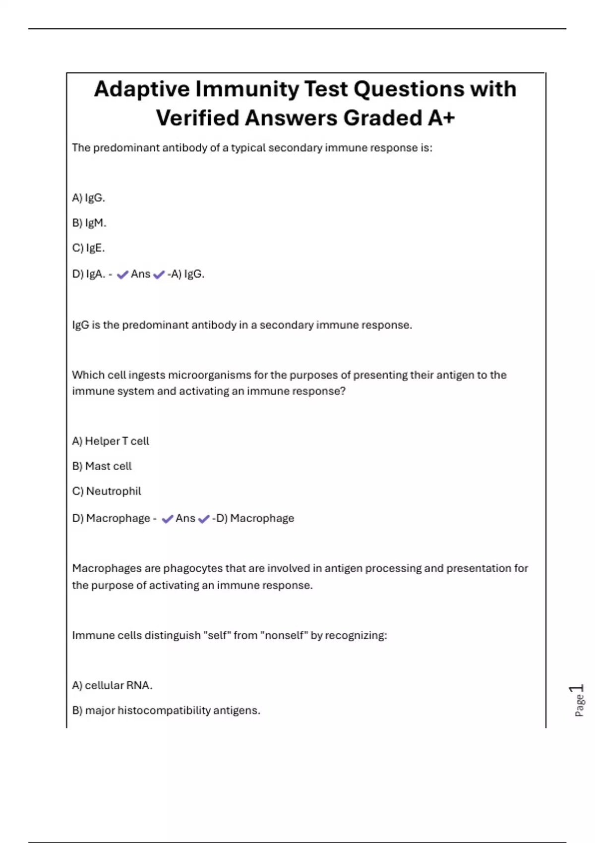 Adaptive Immunity Test Questions with Verified Answers Graded A+ The predominant antibody of a typical secondary immune response is: A) IgG. B) IgM. C) IgE. D) IgA. - Ans -A) IgG. IgG is the predominant antibody in a secondary immune response. Which cell ingests microorganisms for the purposes of presenting their antigen to the immune system and activating an immune response? A) Helper T cell B) Mast cell C) Neutrophil D) Macrophage - Ans -D) Mac