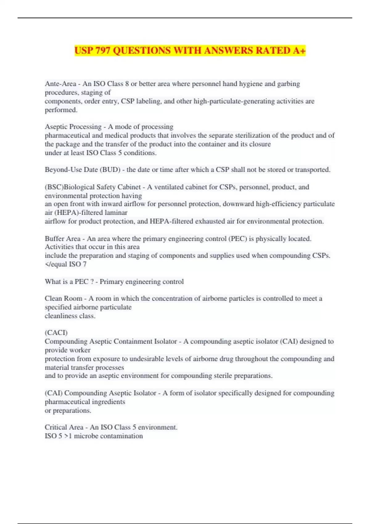 USP 797 QUESTIONS WITH ANSWERS RATED A+