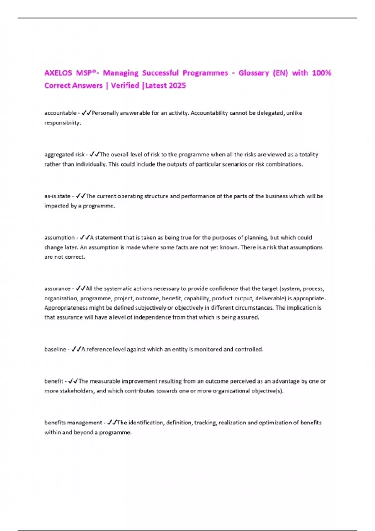 AXELOS MSP®- Managing Successful Programmes - Glossary (EN) with 100% Correct Answers | Verified |Latest 2025