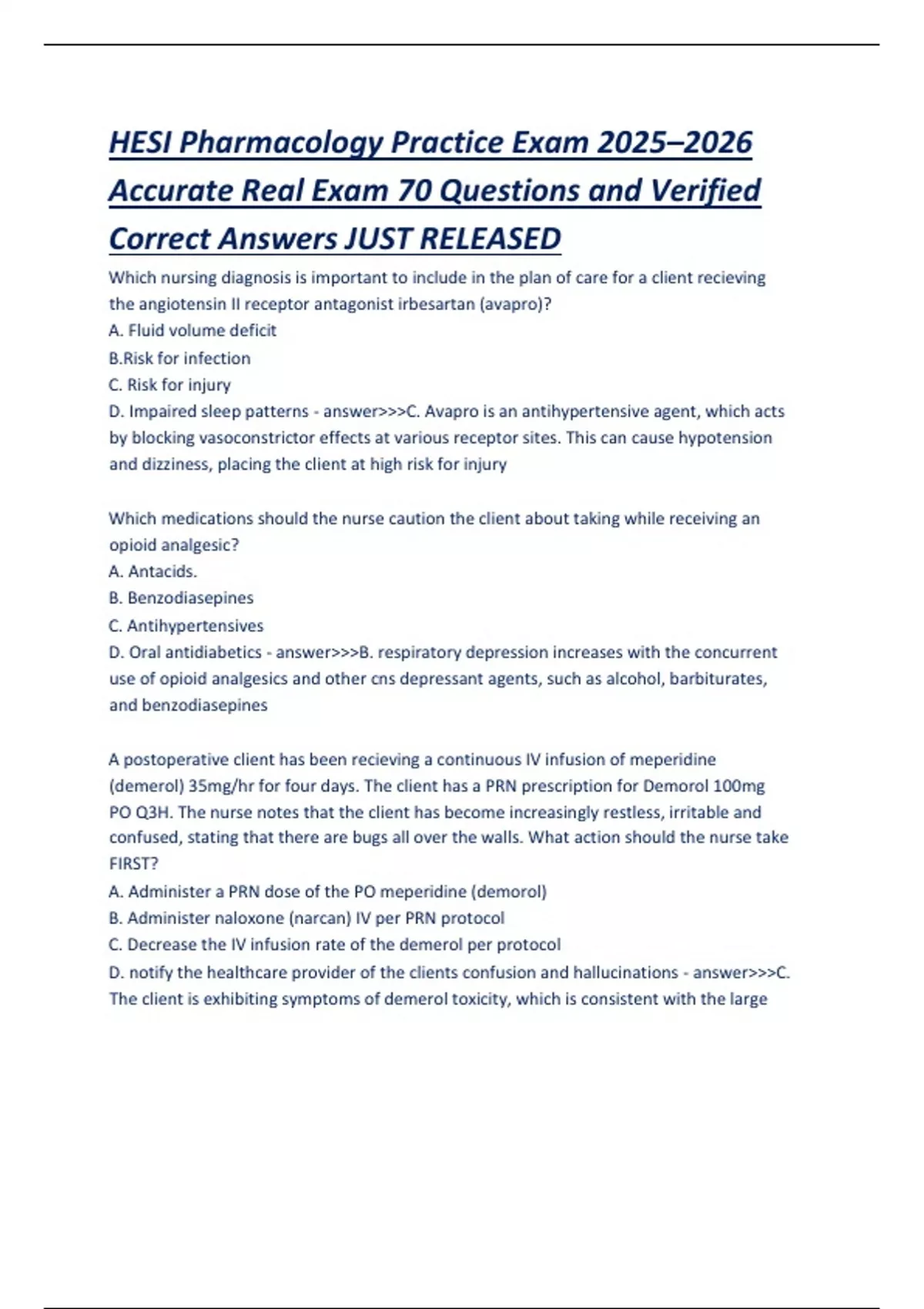 This document provides 70 real exam-style questions with verified correct answers for the HESI Pharmacology Practice Exam, updated for the 2025–2026 academic year. It covers critical pharmacology topics including drug classifications, mechanisms of action, side effects, safe medication administration, dosage calculations, and nursing responsibilities. A valuable resource for nursing students preparing for the HESI Exit Exam or focused pharmacology assessments.