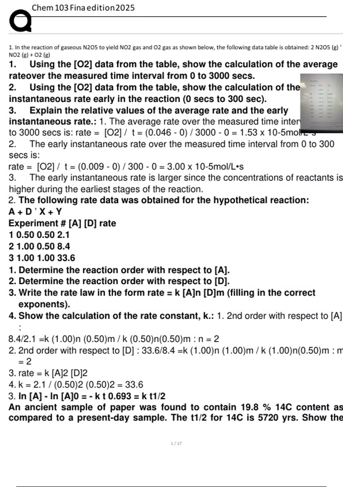 1. In the reaction of gaseous N2O5 to yield NO2 gas and O2 gas as shown below, the following data table is obtained: 2 N2O5 (g) ’