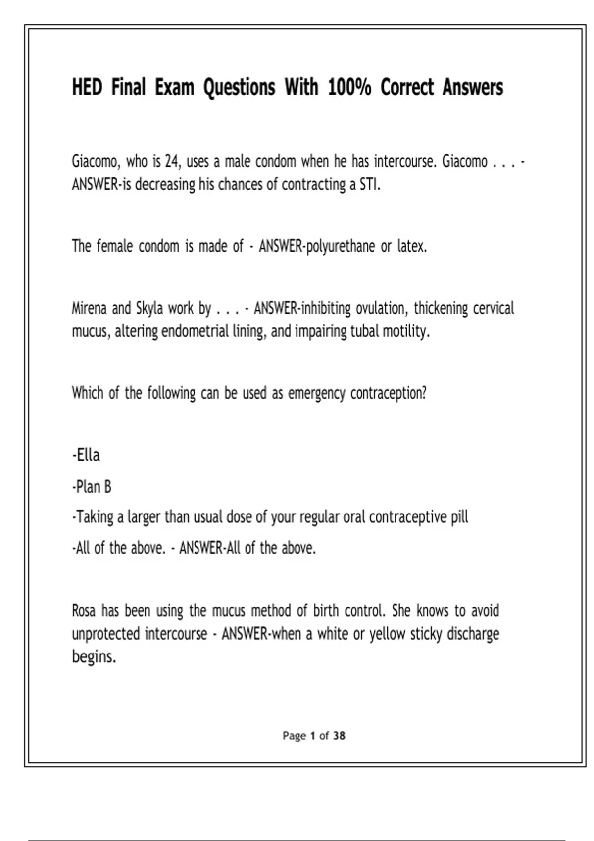 HED Final Exam Questions With 100% Correct Answers Giacomo, who is 24, uses a male condom when he has intercourse. Giacomo . . . - ANSWER-is decreasing his chances of contracting a STI. The female condom is made of - ANSWER-polyurethane or latex. Mirena and Skyla work by . . . - ANSWER-inhibiting ovulation, thickening cervical mucus, altering endometrial lining, and impairing tubal motility. Which of the following can be used as emergency contraception? -Ella -Plan B -Taking a larger than usual dose of your regular oral contraceptive pill -All of the above. - ANSWER-All of the above. Rosa has been using the mucus method of birth control. She knows to avoid unprotected intercourse - ANSWER-when a white or yellow sticky discharge begins. Page 2 of 38 Vasectomy involves cutting and closing the - ANSWER-vas deferens. Oral and anal sex are types of "outercourse." - ANSWER-True Missing even one dose of an oral contraceptive could result in a pregnancy. - ANSWER-True Which of the following statements about a person who is gay or lesbian is FALSE? - A man or woman who is primarily gay or lesbian and has some sexual interest in the opposite sex is called homoflexible. - Lesbians or gay males who refer to themselves as "queer" have a low selfconcept. -A person may be in a heterosexual marriage, have children, and still be homosexual. -LGBTQ is an inclusive acronym used to describe nonheterosexual people. - ANSWER-Lesbians or gay males who refer to themselves as "queer" have a low self-concept. Which of the following statements by men is NOT an example of gender nonconformity? - ANSWER-"I liked hiking and being outdoors." Page 3 of 38 Thomas Jefferson was among the political leaders who - ANSWER-suggested reducing the punishment from death to castration for men who committed homosexual acts. Sodomy laws . . . - ANSWER-technically applied to anyone who engaged in anal or oral sex, but were usually enforced only against LGB individuals. A term used for maintaining the false image of heterosexuality is - ANSWERpassing.