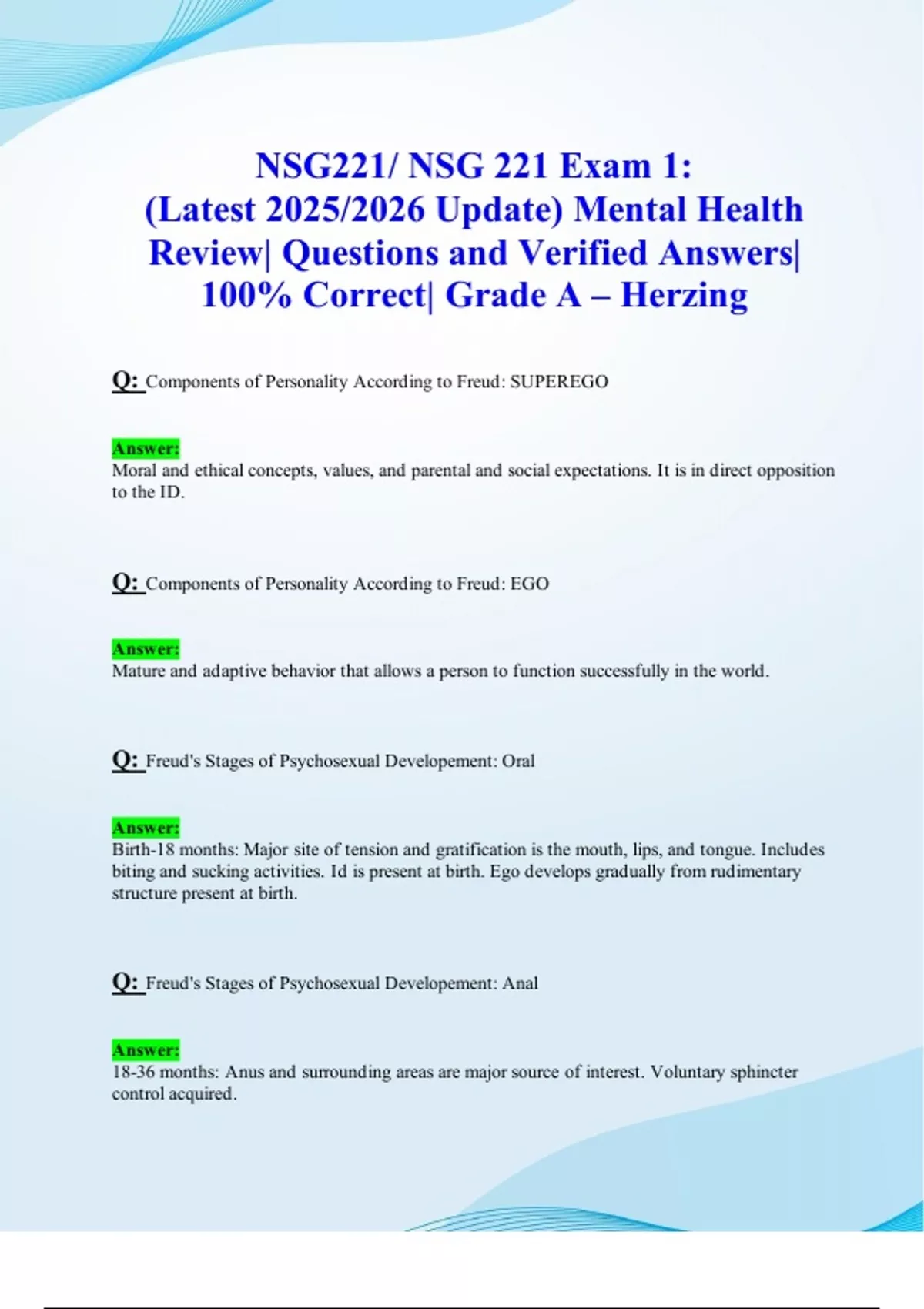 Exams 1,2,3,4 & HESI: NSG221/ NSG 221 (New 2025/ 2026 Updates BUNDLED TOGETHER PACKAGE WITH SOLUTIONS) Mental Health Nursing |Questions & Answers| Grade A| 100% Correct (Verified Solutions)- Herzing