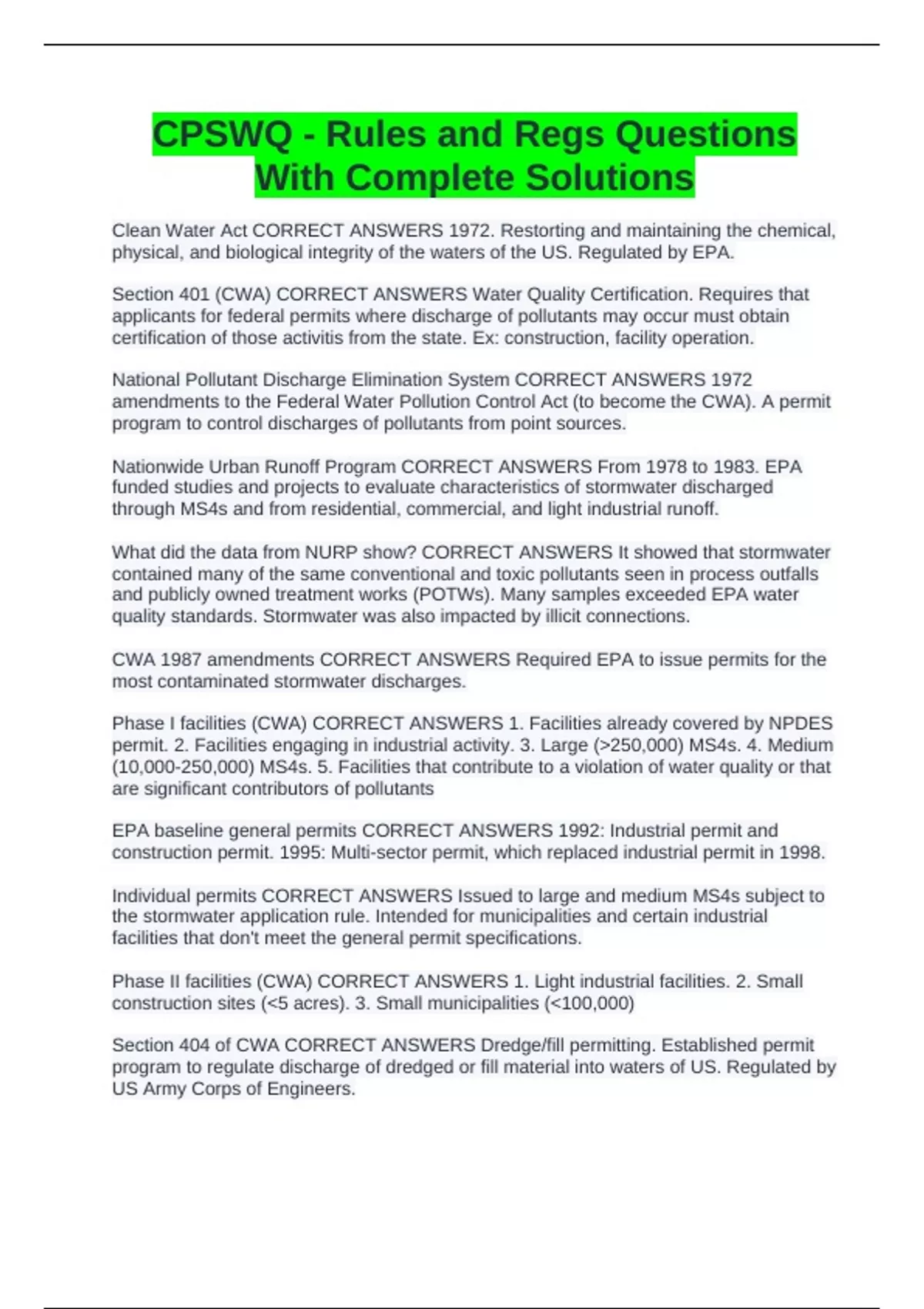 Phase I facilities (CWA) CORRECT ANSWERS 1. Facilities already covered by NPDES