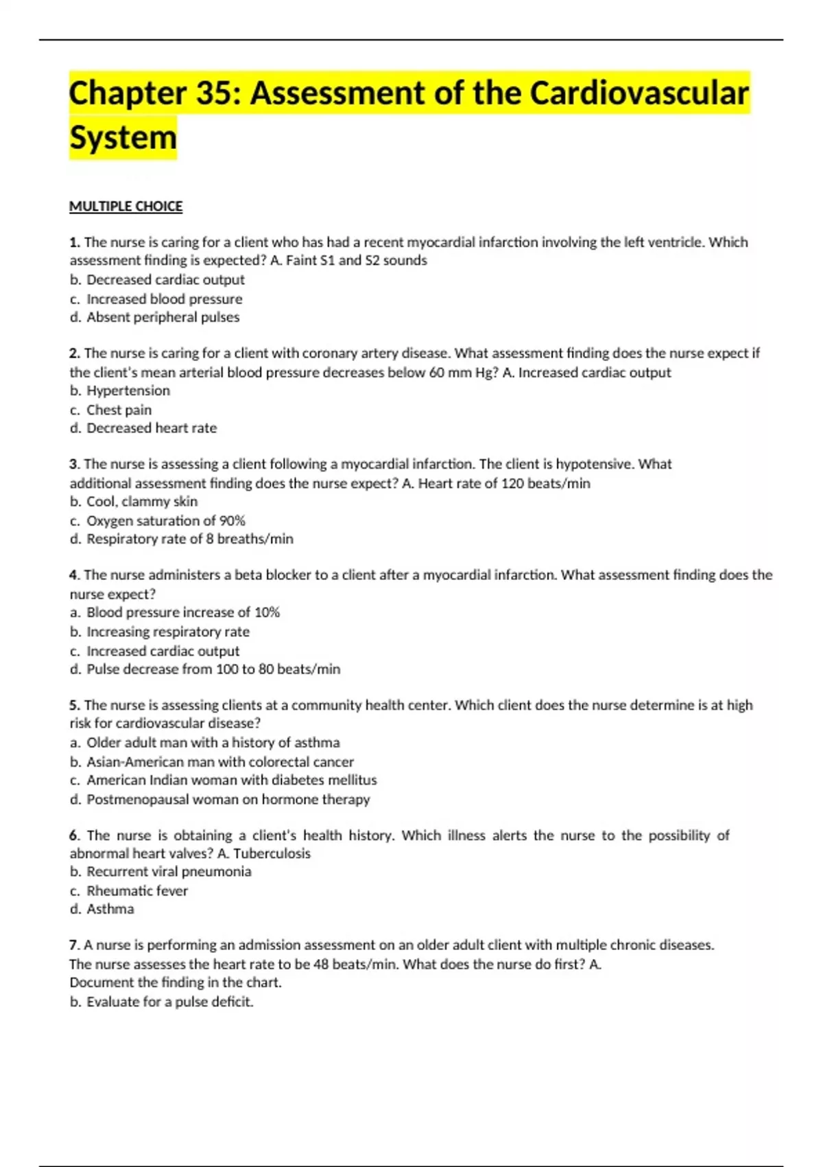 3. The nurse is assessing a client following a myocardial infarction. The client is hypotensive. What