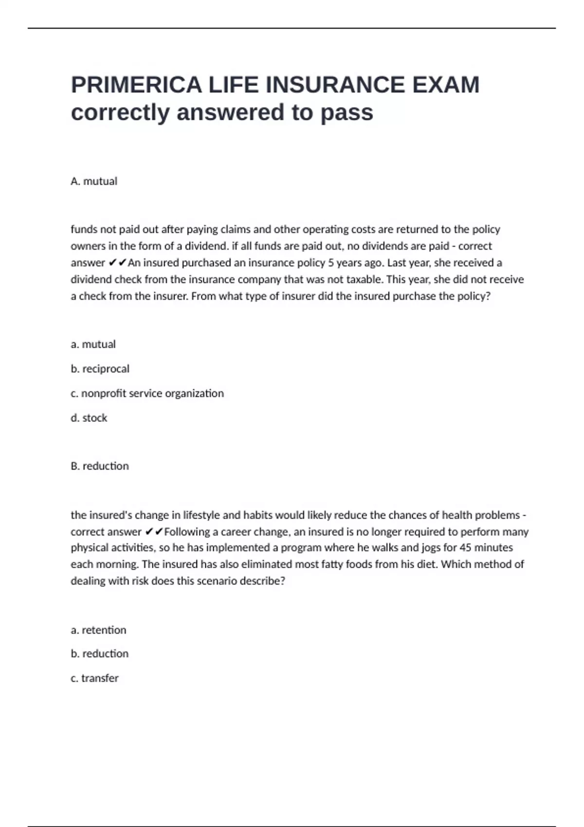 PRIMERICA LIFE INSURANCE EXAM correctly answered to pass