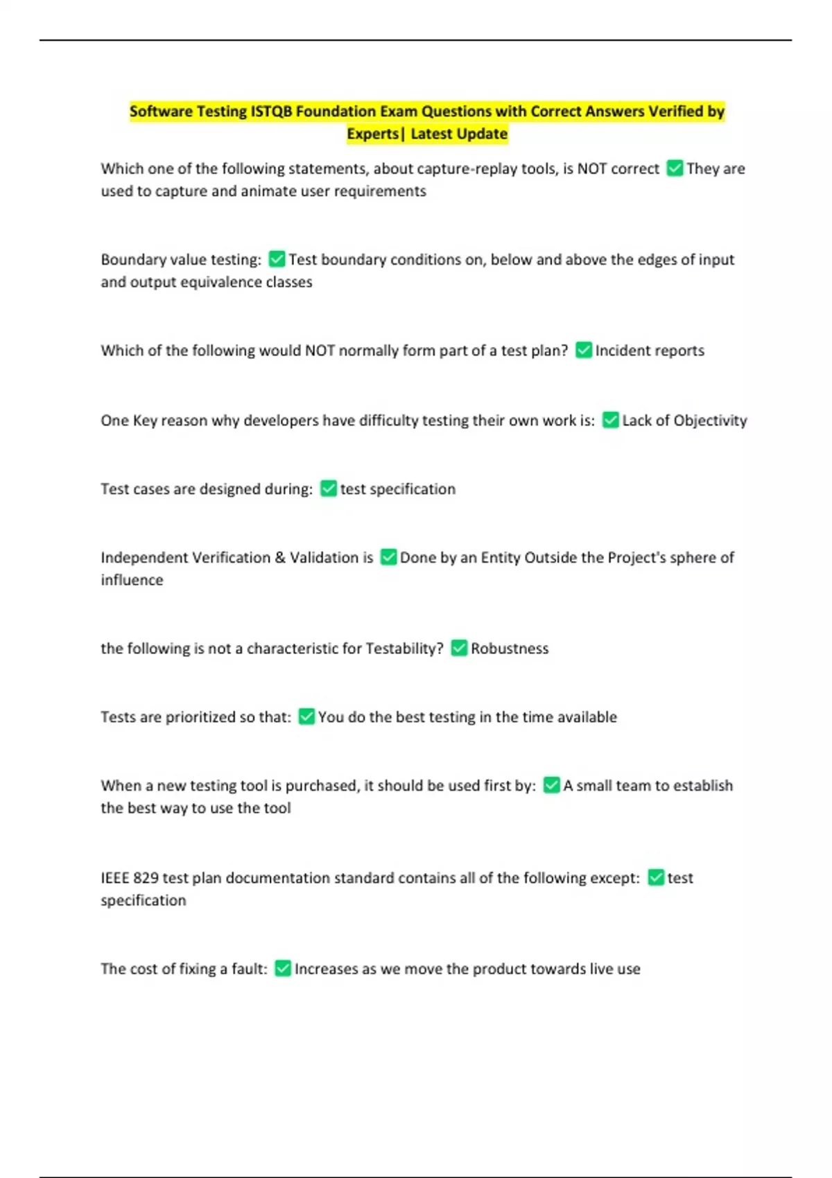 Software Testing ISTQB Foundation Exam Questions with Correct Answers Verified by Experts| Latest Update