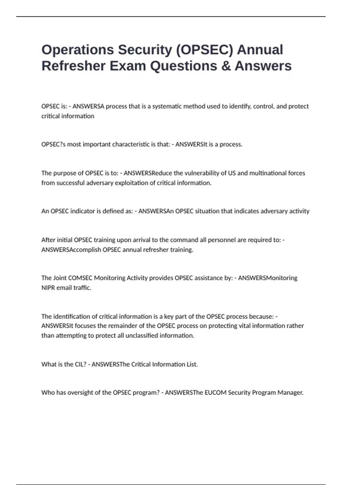 Operations Security (OPSEC) Annual Refresher Exam Questions & Answers