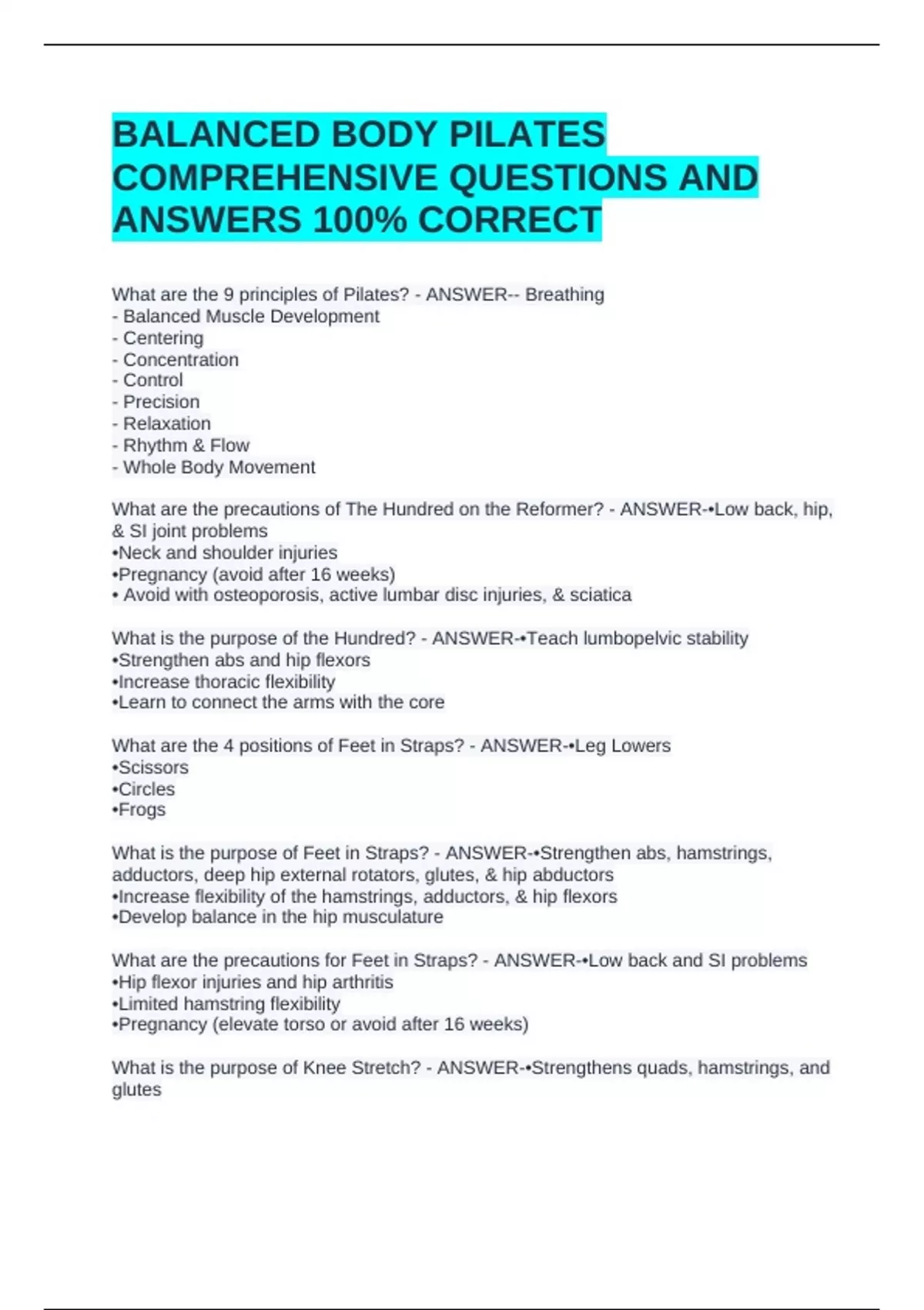 BALANCED BODY PILATES COMPREHENSIVE QUESTIONS AND ANSWERS 100% CORRECTBALANCED BODY PILATES COMPREHENSIVE QUESTIONS AND ANSWERS 100% CORRECTBALANCED BODY PILATES COMPREHENSIVE QUESTIONS AND ANSWERS 100% CORRECT What are the 9 principles of Pilates? - ANSWER-- Breathing - Balanced Muscle Development - Centering - Concentration - Control - Precision - Relaxation - Rhythm & Flow - Whole Body Movement What are the precautions of The Hundred on the Reformer? - ANSWER-•Low back, hip, & SI joint problems •Neck and shoulder injuries •Pregnancy (avoid after 16 weeks) • Avoid with osteoporosis, active lumbar disc injuries, & sciatica What is the purpose of the Hundred? - ANSWER-•Teach lumbopelvic stability •Strengthen abs and hip flexors •Increase thoracic flexibility •Learn to connect the arms with the core What are the 4 positions of Feet in Straps? - ANSWER-•Leg Lowers •Scissors •Circles
