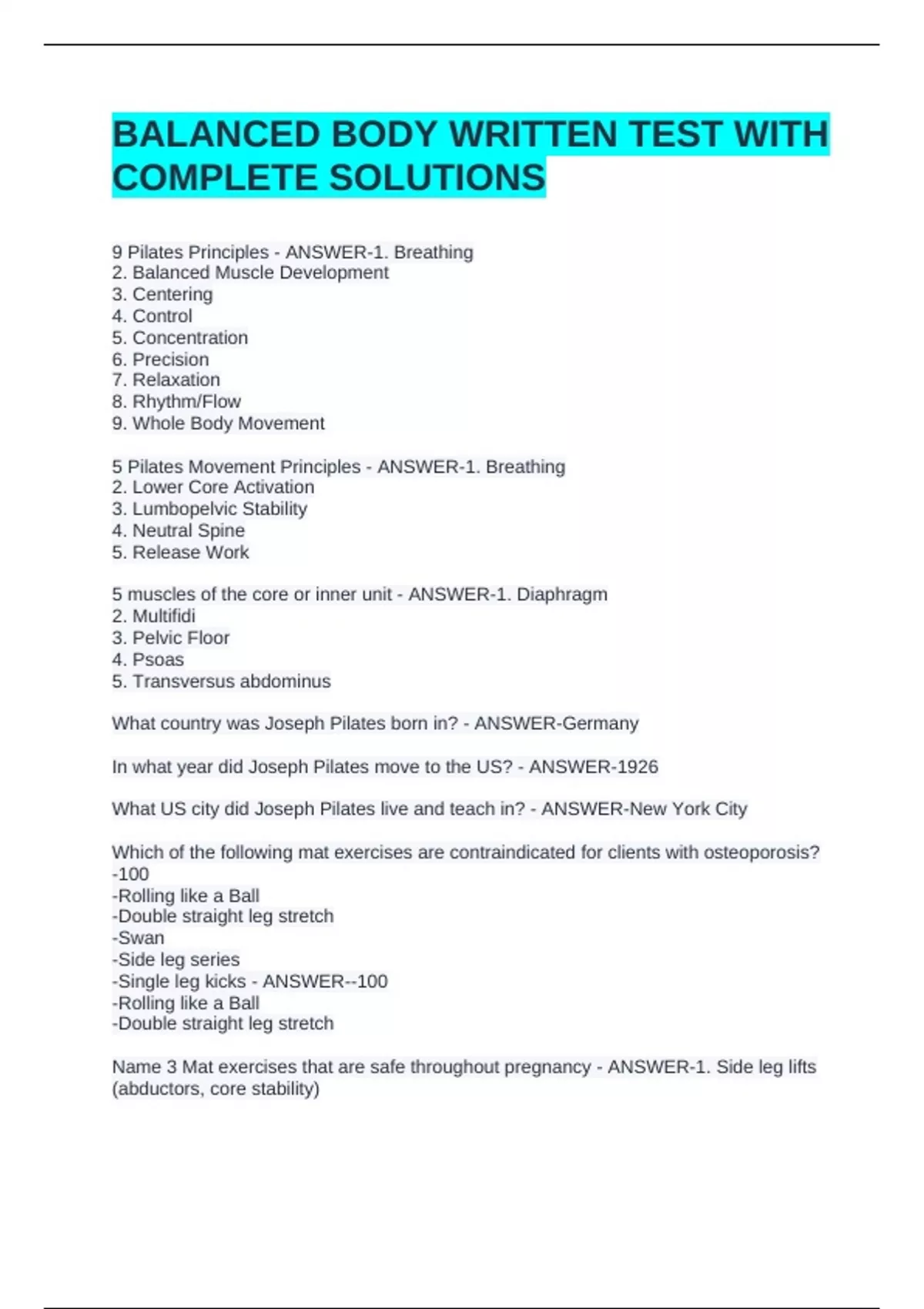 BALANCED BODY WRITTEN TEST WITH COMPLETE SOLUTIONS