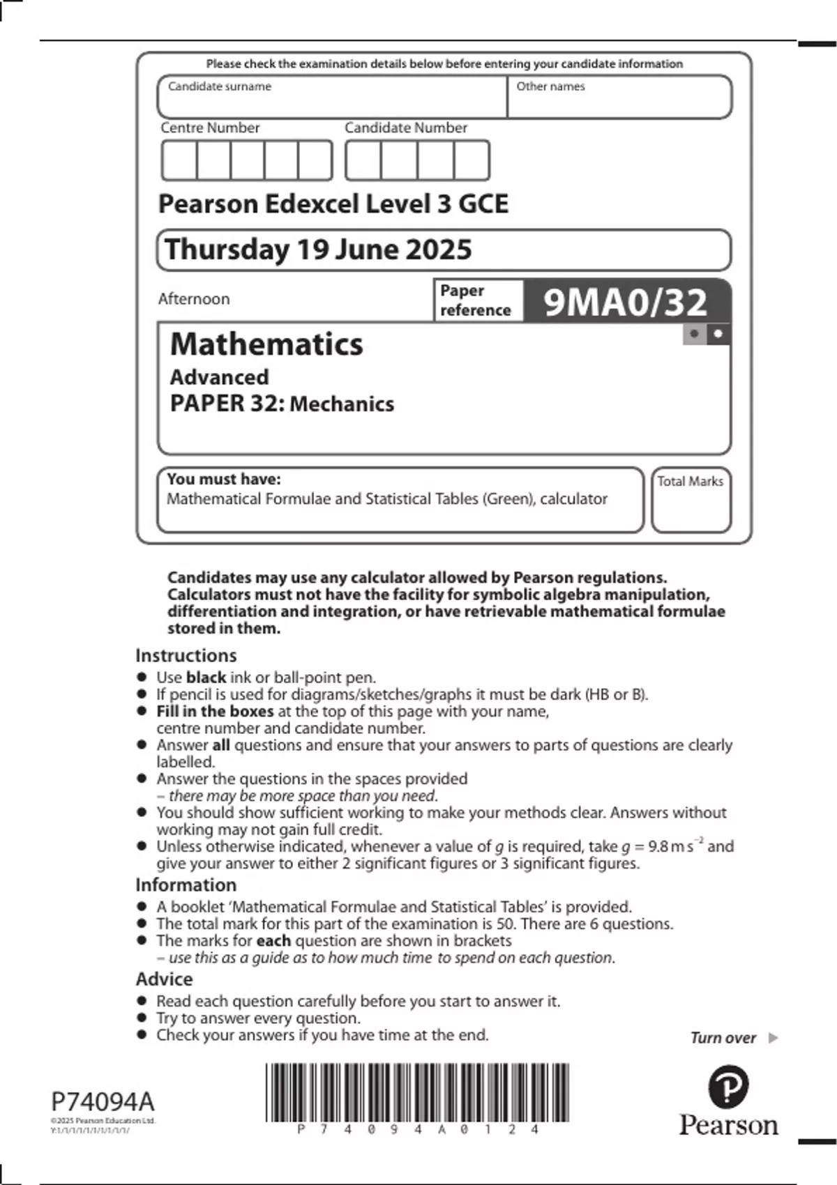 Candidates may use any calculator allowed by Pearson regulations.