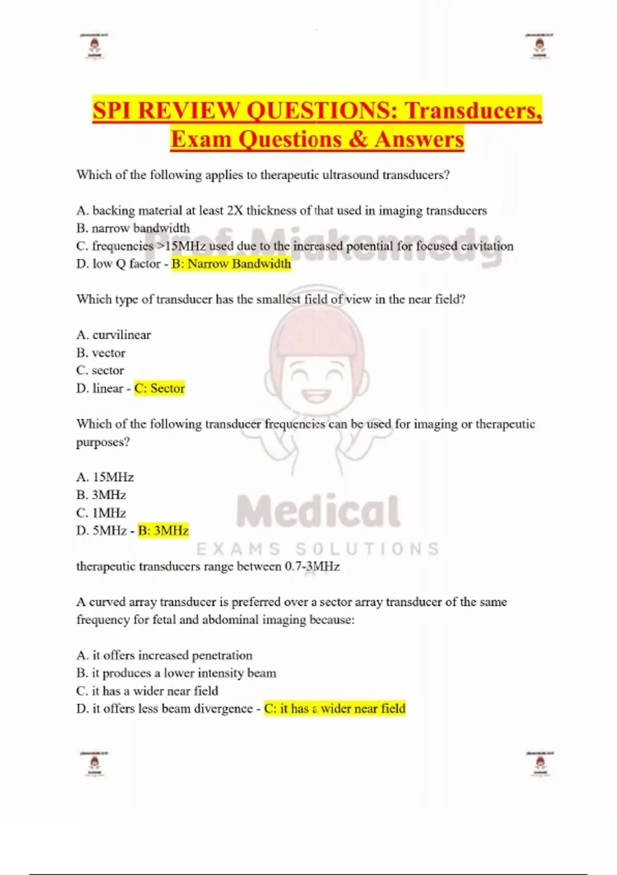 SPI REVIEW QUESTIONS: Transducers, Exam Questions & Answers-Which of the following applies to therapeutic ultrasound transducers? A. backing material at least 2X thickness of that used in imaging transducers B. narrow bandwidth C. frequencies >15MHz used due to the increased potential for focused cavitation D. low Q factor - B: Narrow Bandwidth Which type of transducer has the smallest field of view in the near field? A. curvilinear B. vector C. sector D. linear - C: Sector Which of the following transducer frequencies can be used for imaging or therapeutic purposes? A. 15MHz B. 3MHz C. 1MHz D. 5MHz - B: 3MHz therapeutic transducers range between 0.7-3MHz A curved array transducer is preferred over a sector array transducer of the same frequency for fetal and abdominal imaging because: A. it offers increased penetration B. it produces a lower intensity beam C. it has a wider near field D. it offers less beam divergence - C: it has a wider near field Mirrors and lenses can be used to ________________. A. mechanically focus the US beam B. increase the PRF of the transducer C. improve sound transmission into the body D. electronically focus the US beam - A: mechanically focus the ultrasound beam Which of the following describes a purpose for applying acoustic gel to the face of the transducer? A. To increase the amount of reflection that occurs within the first 2cm of tissue B. To reduce the difference in impedance between the matching layer and the skin C. To increase the amount of refraction that occurs within the first 2cm of tissue D. To reduce the beam intensity just before the sound beam enters the patient - B: to reduce the difference in impedance between the matching layer and the skin 8. A ___________MHz transducer will have the thinnest element. A. 3 B. 5 C. 7 D. 12 - D: 12 higher frequencies will have the thinnest elements Which of the following transducers will produce the highest frequency sound waves? A. 6mm element thickness, 2mm/μs propagation speed of the element B. 2mm element thickness, 6mm/μs propagation speed of the element C. 6mm element thickness, 6mm/μs propagation speed of the element D. 2mm element thickness, 2mm/μs propagation speed of the element - B. 2mm element thickness, 6mm/ms propagation speed of the element