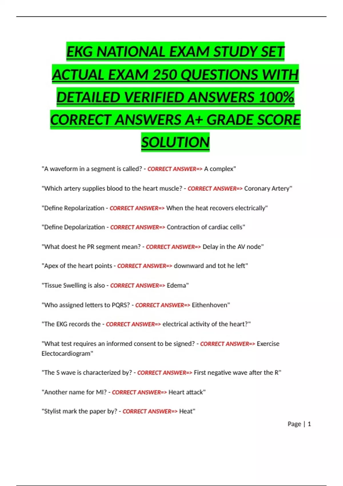 EKG NATIONAL EXAM STUDY SET ACTUAL EXAM 250 QUESTIONS WITH DETAILED VERIFIED ANSWERS 100% CORRECT ANSWERS A+ GRADE SCORE SOLUTION