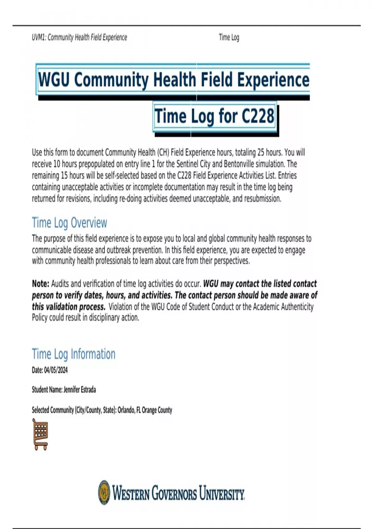 WGU Community Health Field Experience Time Log for C228