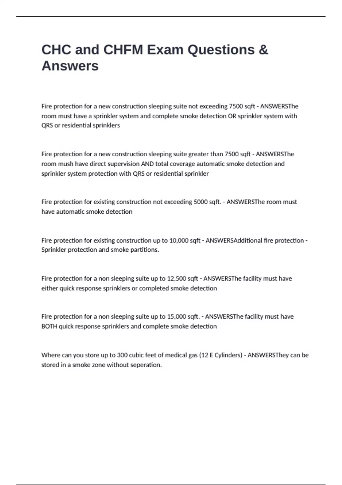 CHC and CHFM Exam Questions & Answers Fire protection for a new construction sleeping suite not exceeding 7500 sqft - ANSWERSThe room must have a sprinkler system and complete smoke detection OR sprinkler system with QRS or residential sprinklers Fire protection for a new construction sleeping suite greater than 7500 sqft - ANSWERSThe room mush have direct supervision AND total coverage automatic smoke detection and sprinkler system protection with QRS or residential sprinkler Fire protection for existing construction not exceeding 5000 sqft. - ANSWERSThe room must have automatic smoke detection Fire protection for existing construction up to 10,000 sqft - ANSWERSAdditional fire protection - Sprinkler protection and smoke partitions. Fire protection for a non sleeping suite up to 12,500 sqft - ANSWERSThe facility must have either quick response sprinklers or completed smoke detection Fire protection for a non sleeping suite up to 15,000 sqft. - ANSWERSThe facility must have BOTH quick response sprinklers and complete smoke detection Where can you store up to 300 cubic feet of medical gas (12 E Cylinders) - ANSWERSThey can be stored in a smoke zone without seperation.