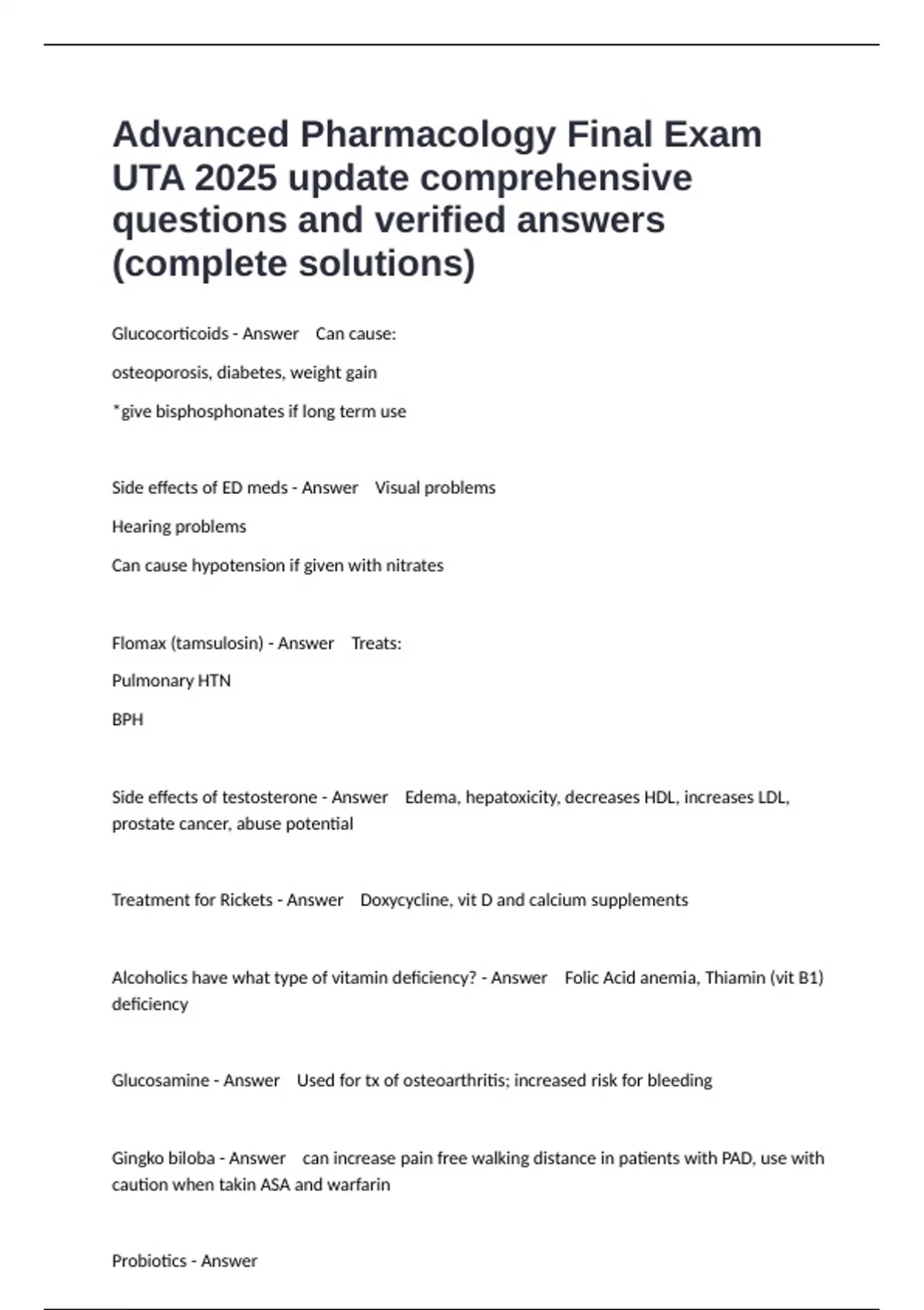 Glucocorticoids - Answer Can cause: osteoporosis, diabetes, weight gain *give bisphosphonates if long term use Side effects of ED meds - Answer Visual problems Hearing problems Can cause hypotension if given with nitrates Flomax (tamsulosin) - Answer Treats: Pulmonary HTN BPH Side effects of testosterone - Answer Edema, hepatoxicity, decreases HDL, increases LDL, prostate cancer, abuse potential Treatment for Rickets - Answer Doxycycline, vit D and calcium supplements Alcoholics have what type of vitamin deficiency? - Answer Folic Acid anemia, Thiamin (vit B1) deficiency Glucosamine - Answer Used for tx of osteoarthritis; increased risk for bleeding Gingko biloba - Answer can increase pain free walking distance in patients with PAD, use with caution when takin ASA and warfarin Probiotics - Answer Which medication is recommended for tx of HTN in pregnancy? - Answer Methyldopa Considerations for elderly patients - Answer Decreased muscle mass