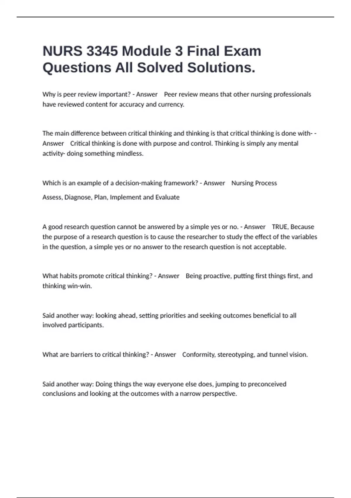 Why is peer review important? - Answer Peer review means that other nursing professionals have reviewed content for accuracy and currency. The main difference between critical thinking and thinking is that critical thinking is done with- - Answer Critical thinking is done with purpose and control. Thinking is simply any mental activity- doing something mindless. Which is an example of a decision-making framework? - Answer Nursing Process Assess, Diagnose, Plan, Implement and Evaluate A good research question cannot be answered by a simple yes or no. - Answer TRUE, Because the purpose of a research question is to cause the researcher to study the effect of the variables in the question, a simple yes or no answer to the research question is not acceptable. What habits promote critical thinking? - Answer Being proactive, putting first things first, and thinking win-win. Said another way: looking ahead, setting priorities and seeking outcomes beneficial to all involved participants. What are barriers to critical thinking? - Answer Conformity, stereotyping, and tunnel vision. Said another way: Doing things the way everyone else does, jumping to preconceived conclusions and looking at the outcomes with a narrow perspective.