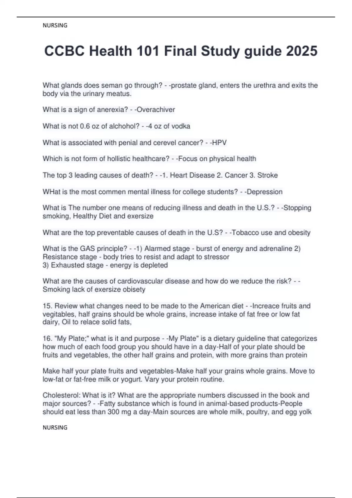 What glands does seman go through? - -prostate gland, enters the urethra and exits the body via the urinary meatus. What is a sign of anerexia? - -Overachiver What is not 0.6 oz of alchohol? - -4 oz of vodka What is associated with penial and cerevel cancer? - -HPV Which is not form of hollistic healthcare? - -Focus on physical health The top 3 leading causes of death? - -1. Heart Disease 2. Cancer 3. Stroke WHat is the most commen mental illness for college students? - -Depression What is The number one means of reducing illness and death in the U.S.? - -Stopping smoking, Healthy Diet and exersize What are the top preventable causes of death in the U.S? - -Tobacco use and obesity What is the GAS principle? - -1) Alarmed stage - burst of energy and adrenaline 2) Resistance stage - body tries to resist and adapt to stressor 3) Exhausted stage - energy is depleted What are the causes of cardiovascular disease and how do we reduce the risk? - Smoking lack of exersize obisety 15. Review what changes need to be made to the American diet - -Increace fruits and vegitables, half grains should be whole grains, increase intake of fat free or low fat dairy, Oil to relace solid fats, 16. "My Plate;" what is it and purpose - -My Plate" is a dietary guideline that categorizes how much of each food group you should have in a day-Half of your plate should be fruits and vegetables, the other half grains and protein, with more grains than protein Make half your plate fruits and vegetables-Make half your grains whole grains. Move to low-fat or fat-free milk or yogurt. Vary your protein routine. Cholesterol: What is it? What are the appropriate numbers discussed in the book and major sources? - -Fatty substance which is found in animal-based products-People should eat less than 300 mg a day-Main sources are whole milk, poultry, and egg yolk NURSING NURSING How do you improve cardiovascular endurance, muscle strength, muscle endurance and flexibility? - --Cardiorespiratory endurance exercise: 150 minutes of moderate intensity or 75 minutes of vigorous-intensity per week (or a combination)-Muscular strength and endurance: Work major muscle groups at least 2 non consecutive days a week-Flexibility exercise: Stretch at least 2-3 days a week, ideally 5-7 days What are the most dangerous drugs in U.S.? - --Heroin-Oxycodone-Cocaine Which group/population is at the highest risk and why? - -Poor males whose peers use drugs What are the different categories of drugs? - -Stimulants: Increases heart rate, stimulates the central nervous systemDepressants: CNS suppressors Hallucinogens: Cause hallucinationsOpioids and Opiates: Block opioid receptors What are the health implications caused from smoking tobacco? - -lung cancer Chronic Obstructive Pulmonary Disease (COPD), emphysema chronic bronchitis heart attack stroke 36. What is the difference between malignant and benign tumor? - --A malignant tumor is cancerous and can metastasize (spread) to other areas in the body -A benign tumor is non-cancerous and cannot spread What is not a sign of clymidia and gnorea? - -a sore What are examples of opiods? - -Heroin, Opium, Morphine, Oxycoden, Codien, hydrocodine. What are the most common types of cancers? - -Breast cancer and lung cancer What is the best contriception method for someone at risk of blood clots? - -The Depo Provera® shot, condoms, and diaphragms are also estrogen-free and safe