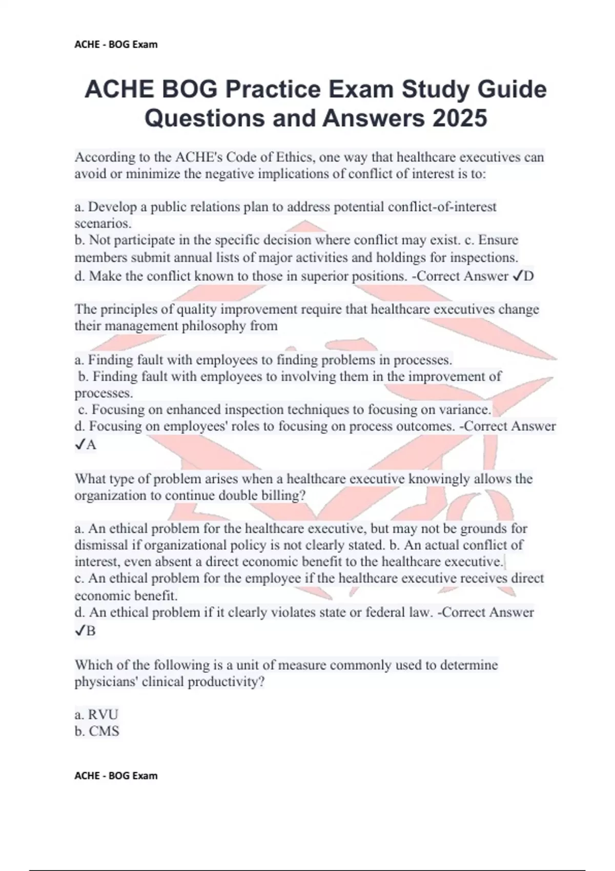 ACHE BOG Practice Exam Study Guide