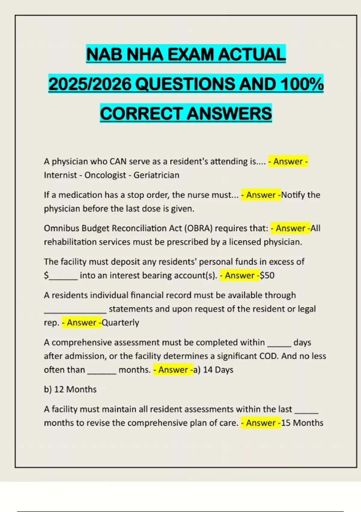 NAB NHA EXAM ACTUAL 2025/2026 QUESTIONS AND 100% CORRECT ANSWERS A physician who CAN serve as a resident's attending is.... - Answer - Internist - Oncologist - Geriatrician If a medication has a stop order, the nurse must... - Answer -Notify the physician before the last dose is given. Omnibus Budget Reconciliation Act (OBRA) requires that: - Answer -All rehabilitation services must be prescribed by a licensed physician. The facility must deposit any residents' personal funds in excess of $______ into an interest bearing account(s). - Answer -$50 A residents individual financial record must be available through _____________ statements and upon request of the resident or legal rep. - Answer -Quarterly A comprehensive assessment must be completed within _____ days after admission, or the facility determines a significant COD. And no less often than ______ months. - Answer -a) 14 Days b) 12 Months A facility must maintain all resident assessments within the last _____ months to revise the comprehensive plan of care. - Answer -15 MonthsA comprehensive care plan must be developed within ____ days after completion of the comprehensive assessment. - Answer -7 Days The development of a comprehensive care plan should include an interdisciplinary team made of whom? - Answer -Attending Physician - Registered Nurse - The Resident/Family An unnecessary drug is one that is used in....? - Answer -Excessive doses/duration The facility must ensure that it is free of medication error rates of _____% or greater. - Answer -5% The DNS may serve as a charge nurse only when the facility has an (ADC) of ______ or fewer residents. - Answer -60 A resident must be seen by a physician at least once every _____ days for the first _____ days after admission, and at least once every _____ days thereafter. - Answer -a) 30 Days b) 90 Days