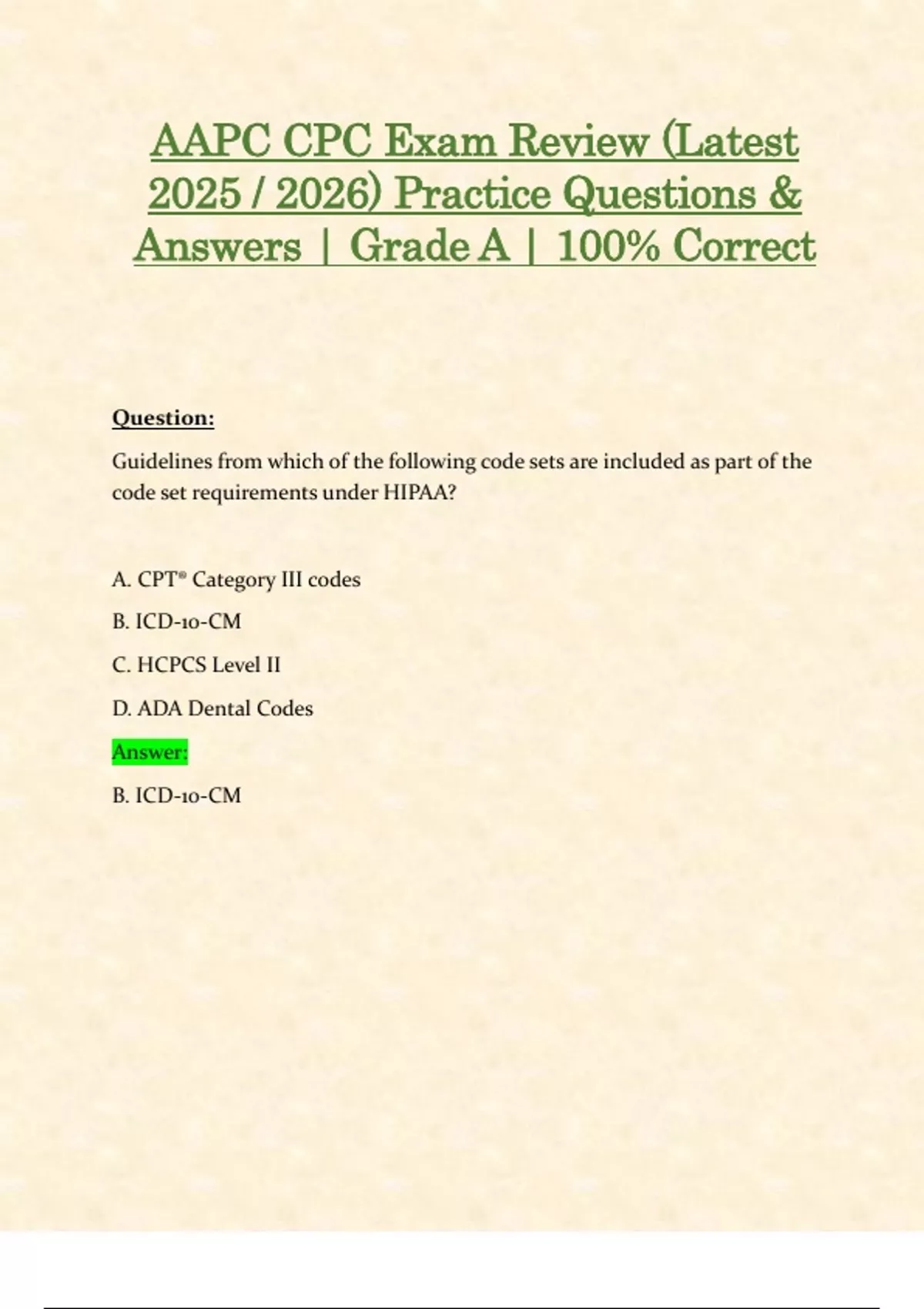 AAPC CPC Exam Review (Latest 2025 / 2026) Practice Questions & Answers | Grade A | 100% Correct Question: Guidelines from which of the following code sets are included as part of the code set requirements under HIPAA? A. CPT® Category III codes B. ICD-10-CM C. HCPCS Level II D. ADA Dental Codes Answer: B. ICD-10-CM Question: Which of the following is an example of electronic data? A. A digital X-ray B. An explanation of benefits C. An advance beneficiary notice D. A written prescription Answer: A. A digital X-ray