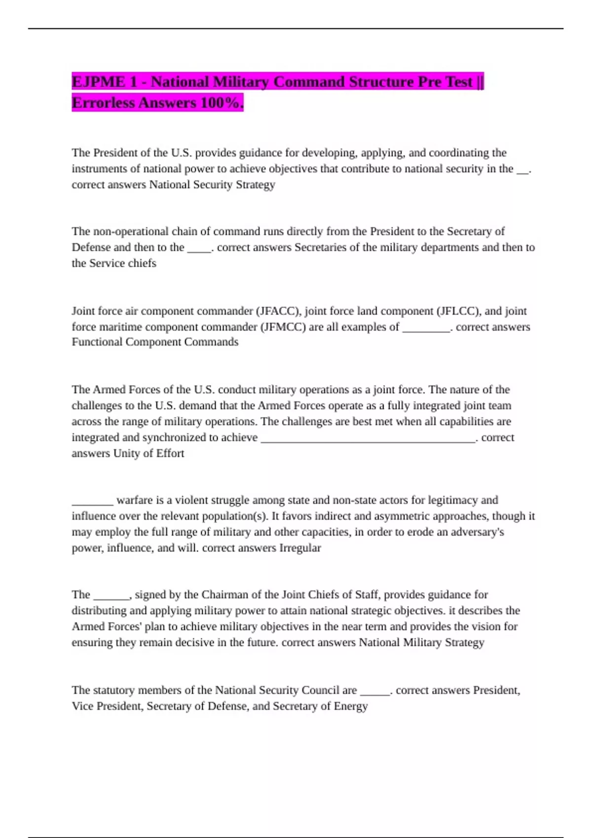 EJPME 1 - National Military Command Structure Pre Test || Errorless Answers 100%.