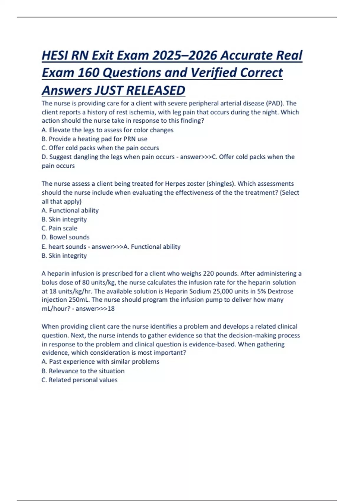This document provides 160 accurate and verified real exam questions with correct answers for the HESI RN Exit Exam, updated for the 2025–2026 academic cycle. It covers all major nursing content areas including pharmacology, medical-surgical nursing, maternal-child health, psychiatric nursing, and critical care. Designed to mirror the NCLEX-RN style and structure, this resource is ideal for final-year nursing students preparing for licensure.