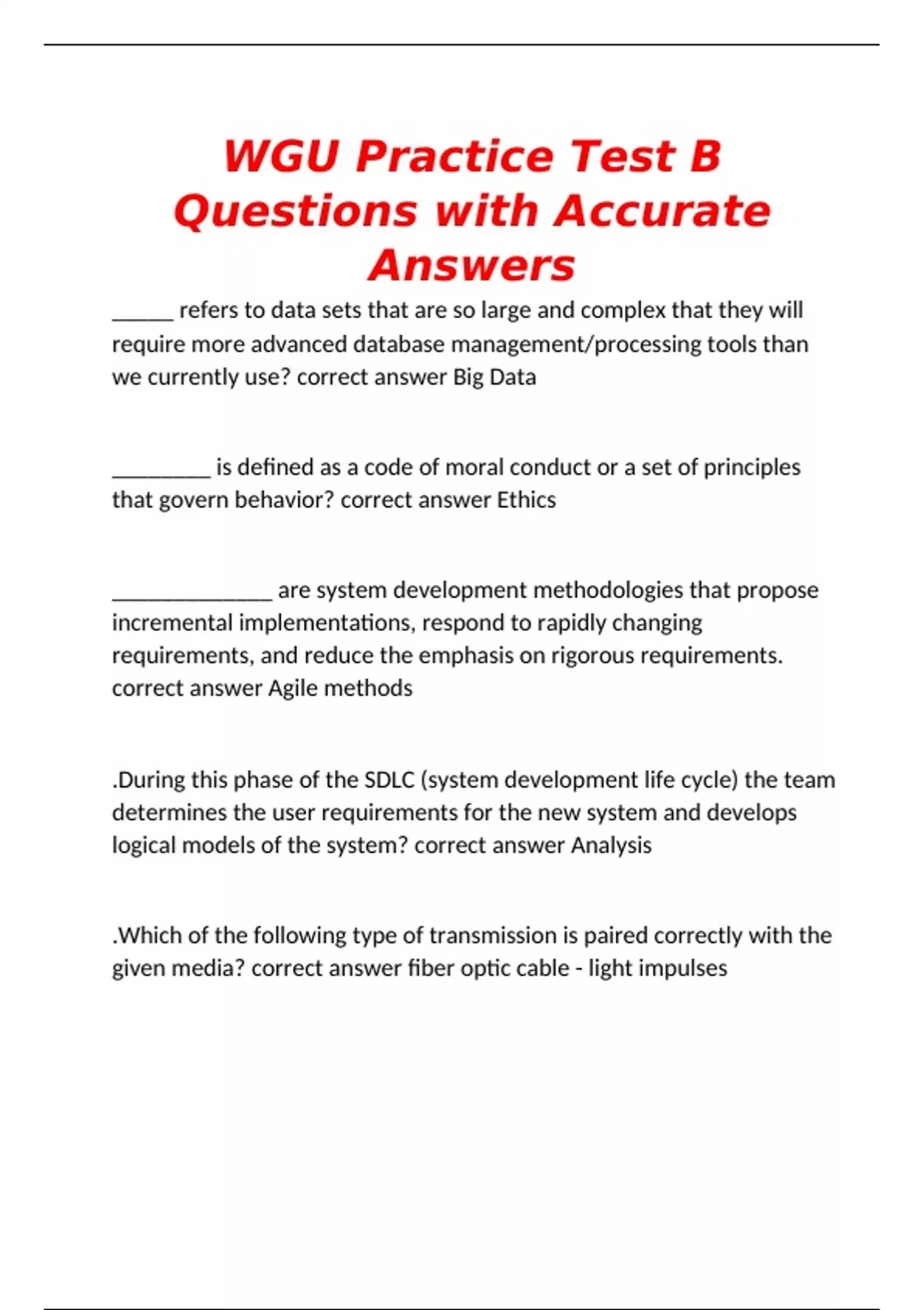 _____ refers to data sets that are so large and complex that they will require more advanced database management/processing tools than we currently use? correct answer Big Data ________ is defined as a code of moral conduct or a set of principles that govern behavior? correct answer Ethics _____________ are system development methodologies that propose incremental implementations, respond to rapidly changing requirements, and reduce the emphasis on rigorous requirements. correct answer Agile methods .During this phase of the SDLC (system development life cycle) the team determines the user requirements for the new system and develops logical models of the system? correct answer Analysis .Which of the following type of transmission is paired correctly with the given media? correct answer fiber optic cable - light impulses A ________ translates source code into machine language and translates the entire program, creating an executable program which can be run at a later time. correct answer Compiler