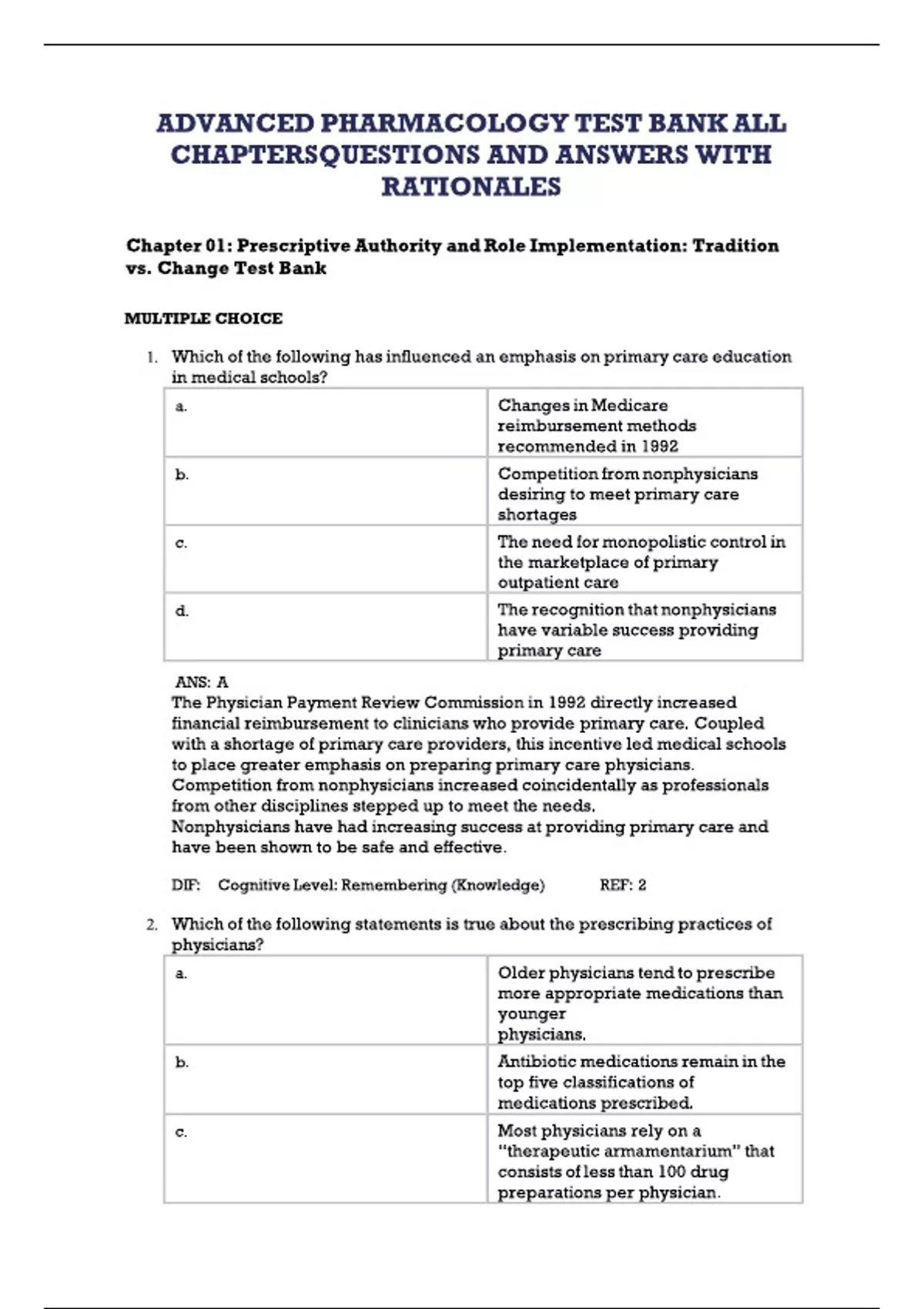 ADVANCED PHARMACOLOGY TEST BANK ALL CHAPTERS QUESTIONS AND ANSWERS WITH RATIONALES