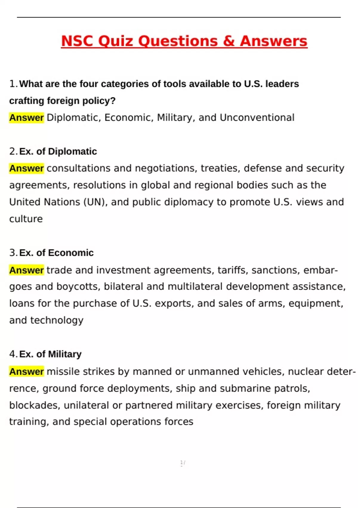 Answer Diplomatic, Economic, Military, and Unconventional