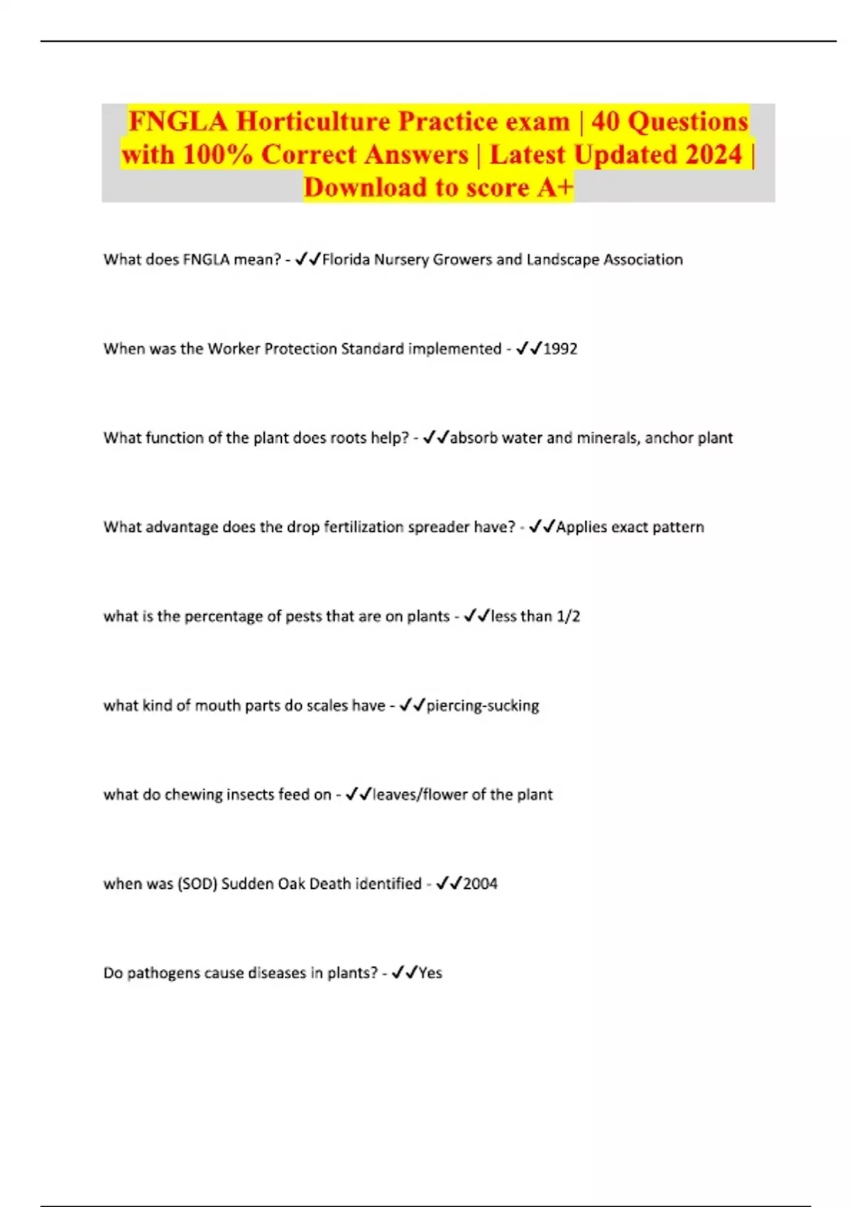 FNGLA Horticulture Practice Exam 40 Questions with 100% Correct Answers Latest Update 2024 Download to Achieve an A+