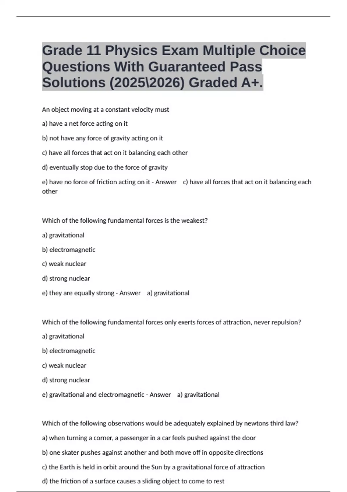 An object moving at a constant velocity must a) have a net force acting on it b) not have any force of gravity acting on it c) have all forces that act on it balancing each other d) eventually stop due to the force of gravity e) have no force of friction acting on it - Answer c) have all forces that act on it balancing each other Which of the following fundamental forces is the weakest? a) gravitational b) electromagnetic c) weak nuclear d) strong nuclear e) they are equally strong - Answer a) gravitational Which of the following fundamental forces only exerts forces of attraction, never repulsion? a) gravitational b) electromagnetic c) weak nuclear d) strong nuclear e) gravitational and electromagnetic - Answer a) gravitational Which of the following observations would be adequately explained by newtons third law? a) when turning a corner, a passenger in a car feels pushed against the door b) one skater pushes against another and both move off in opposite directions c) the Earth is held in orbit around the Sun by a gravitational force of attraction d) the friction of a surface causes a sliding object to come to rest e) a car's tires slip on an ice covered surface - Answer b) one skater pushes against another and both move off in opposite directions